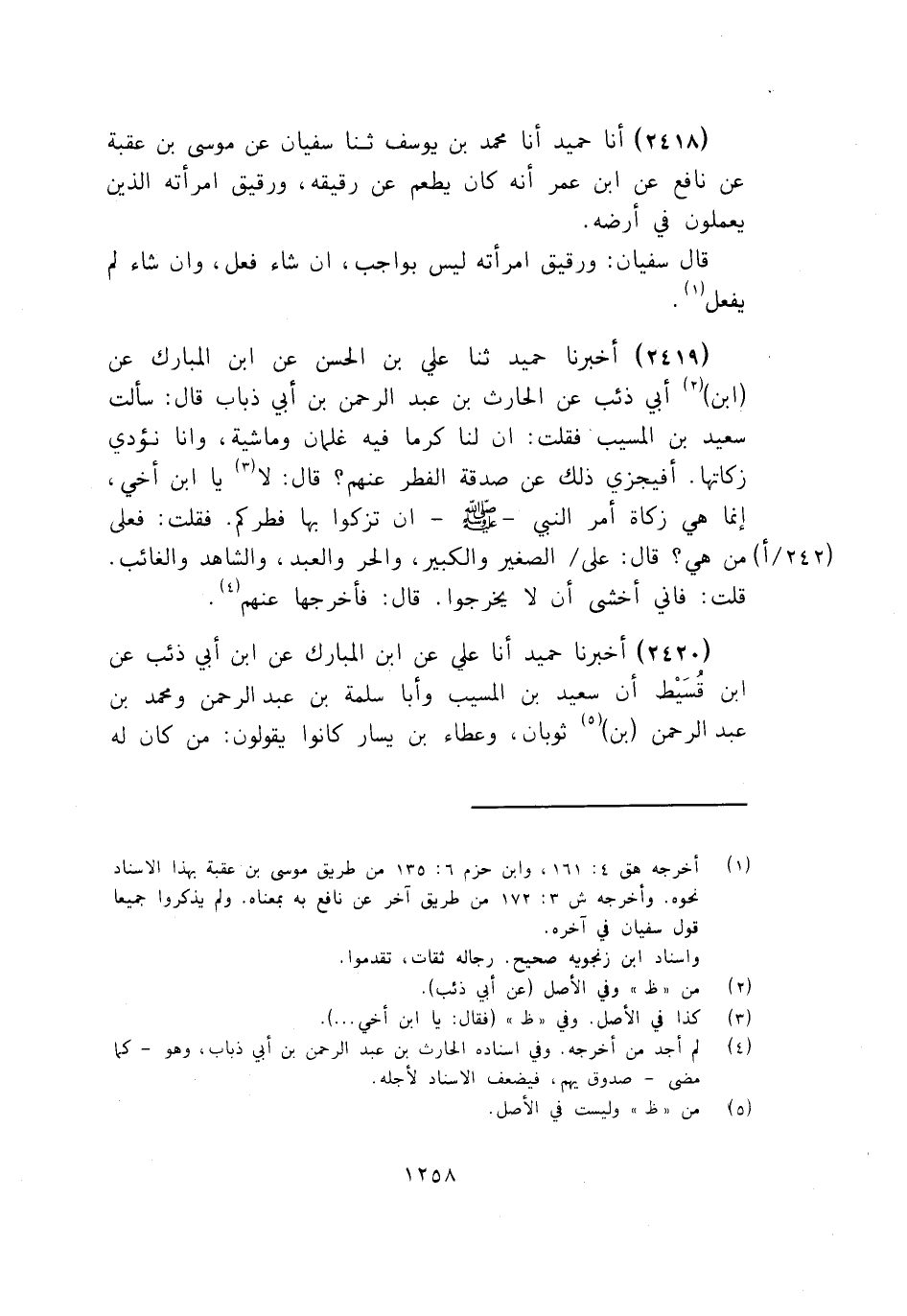 2418 - أَخْبَرَنَا حُمَيْدٌ أنا مُحَمَّدُ بْنُ يُوسُفَ، ثَنَا سُفْيَانُ، عَنْ مُوسَى بْنِ عُقْبَةَ، عَنْ نَافِعٍ، عَنِ ابْنِ عُمَرَ: «أَنَّهُ كَانَ §يُطْعِمُ عَنْ رَقِيقِهِ، وَرَقِيقِ امْرَأَتِهِ الَّذِينَ يَعْمَلُونَ فِي أَرْضِهِ» قَالَ سُفْيَانُ: وَرَقِيقُ امْرَأَتِهِ لَيْسَ بِوَاجِبٍ، إِنْ شَاءَ فَعَلَ، وَإِنْ شَاءَ لَمْ يَفْعَلْ
