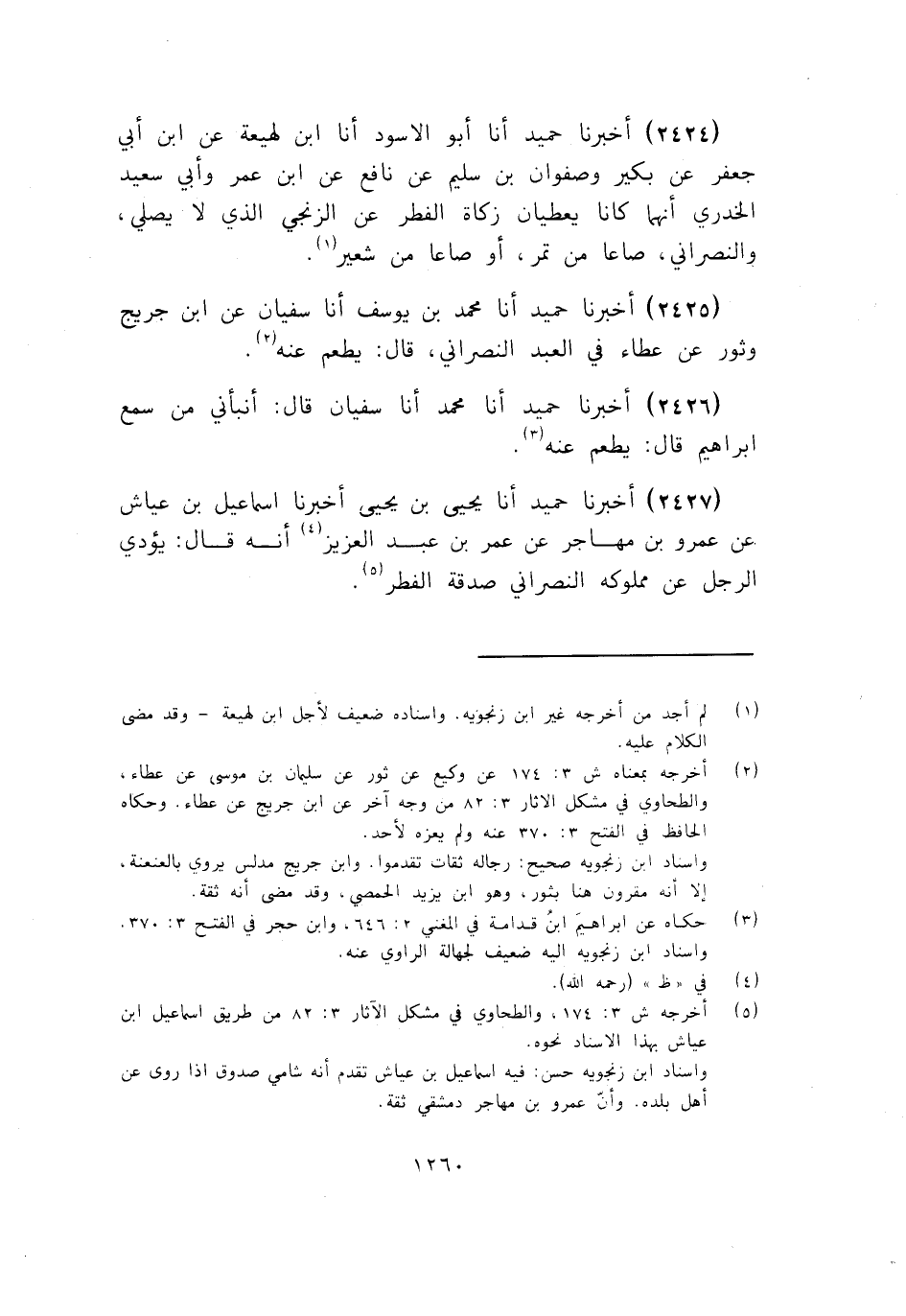 2424 - أَخْبَرَنَا حُمَيْدٌ أنا أَبُو الْأَسْوَدِ، أنا ابْنُ لَهِيعَةَ، عَنِ ابْنِ أَبِي جَعْفَرٍ، عَنْ بُكَيْرٍ، وَصَفْوَانَ بْنِ سُلَيْمٍ، عَنْ نَافِعٍ، عَنِ ابْنِ عُمَرَ، وَأَبِي سَعِيدٍ الْخُدْرِيِّ: «أَنَّهُمَا كَانَ §يُعْطِيَانِ زَكَاةَ الْفِطْرِ عَنِ الزَّنْجِيِّ الَّذِي لَا يُصَلِّي، وَالنَّصْرَانِيِّ، صَاعًا مِنْ تَمْرٍ، أَوْ صَاعًا مِنْ شَعِيرٍ»