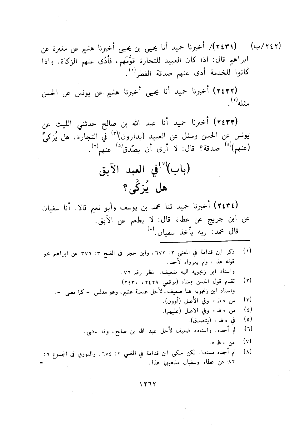 2431 - أَخْبَرَنَا حُمَيْدٌ أنا يَحْيَى بْنُ يَحْيَى، أَخْبَرَنَا هُشَيْمٌ، عَنْ مُغِيرَةَ، عَنْ إِبْرَاهِيمَ قَالَ: «§إِذَا كَانَ الْعَبِيدُ لِلتِّجَارَةِ قَوَّمَهُمْ، فَأَدَّى عَنْهُمُ الزَّكَاةَ، وَإِذَا كَانُوا لِلْخِدْمَةِ أَدَّى عَنْهُمْ صَدَقَةَ الْفِطْرِ» .