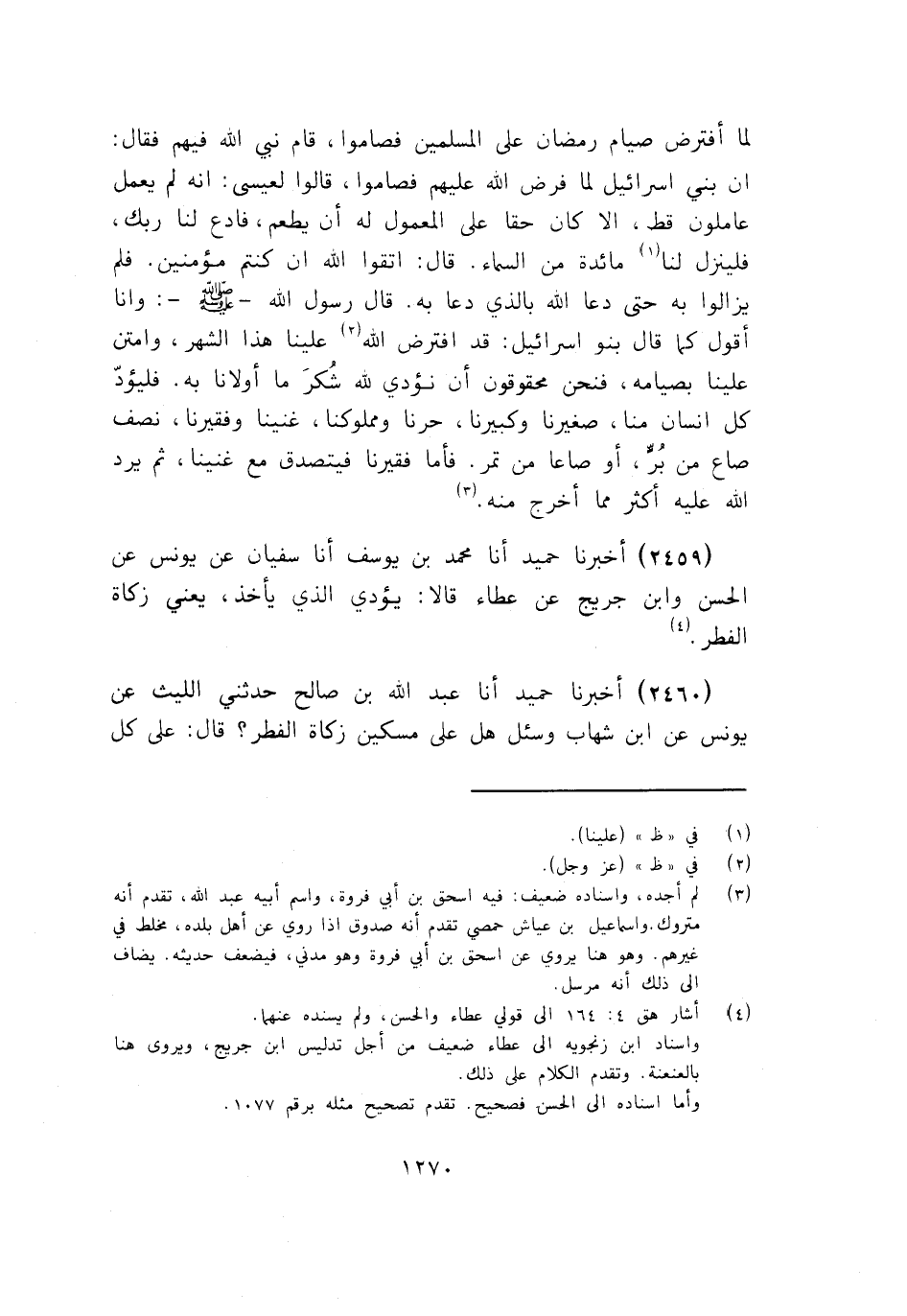 2460 - أَخْبَرَنَا حُمَيْدٌ أنا عَبْدُ اللَّهِ بْنُ صَالِحٍ، حَدَّثَنِي اللَّيْثُ، عَنْ يُونُسَ، عَنِ ابْنِ شِهَابٍ وَسُئِلَ: هَلْ عَلَى مِسْكِينٍ زَكَاةُ الْفِطْرِ؟ قَالَ: «§عَلَى كُلِّ -[1271]- غَنِيٍّ وَمِسْكِينٍ إِلَّا عَلَى مَنْ لَا يَجِدُهَا»