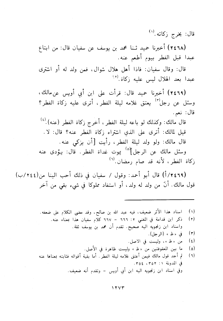 2469 - قَالَ: قَرَأْتُ عَلَى ابْنِ أَبِي أُوَيْسٍ، عَنْ مَالِكٍ " وَسُئِلَ عَنْ §رَجُلٍ يُعْتِقُ غُلَامَهُ لَيْلَةَ الْفِطْرِ، أَتَرَى عَلَيْهِ زَكَاةَ الْفِطْرِ؟ قَالَ: نَعَمْ قَالَ مَالِكٌ: وَكَذَلِكَ لَوْ بَاعَهُ لَيْلَةَ الْفِطْرِ، أَخْرَجَ زَكَاةَ الْفِطْرِ عَنْهُ قِيلَ لِمَالِكٍ: أَتَرَى عَلَى الَّذِي اشْتَرَاهُ زَكَاةَ الْفِطْرِ عَنْهُ؟ قَالَ: لَا قَالَ مَالِكٌ: وَلَوْ وُلِدَ لَيْلَةَ الْفِطْرِ، رَأَيْتَ أَنْ يُزَكِّي عَنْهُ، وَسُئِلَ مَالِكٌ عَنِ الرَّجُلِ يَمُوتُ غَدَاةَ الْفِطْرِ، قَالَ: يُؤَدَّى عَنْهُ زَكَاةُ الْفِطْرِ؛ لِأَنَّهُ قَدْ صَامَ رَمَضَانَ قَالَ أَبُو أَحْمَدَ: وَقَوْلُ سُفْيَانَ فِي ذَلِكَ أَحَبُّ إِلَيْنَا مِنْ قَوْلِ مَالِكٍ، أَنَّ مَنْ وُلِدَ لَهُ وَلَدٌ، أَوِ اسْتَفَادَ مَمْلُوكًا فِي شَيْءٍ بَقِيَ مِنْ آخِرِ -[1274]- يَوْمٍ فِي رَمَضَانَ، فَعَلَيْهِ أَنْ يُطْعِمَ عَنْهُ، فَإِنْ وُلِدَ لَهُ، أَوِ اسْتَفَادَ بَعْدَ غُيُوبِ الشَّمْسِ، فَلَا زَكَاةَ عَلَيْهِ، وَكَذَلِكَ الْمُشْرِكُ إِذَا أَسْلَمَ قَبْلَ غُيُوبِ الشَّمْسِ، فَعَلَيْهِ أَنْ يُطْعِمَ عَنْ نَفْسِهِ، وَمَنْ مَاتَ فِي ذَلِكَ الْيَوْمِ قَبْلَ غُيُوبِ الشَّمْسِ فَلَا زَكَاةَ عَلَيْهِ، فَإِنْ مَاتَ بَعْدَ غُيُوبِ الشَّمْسِ، يُطْعَمُ عَنْهُ مِنْ مَالِهِ وَإِنْ وَهَبَ رَجُلٌ لِرَجُلٍ مَمْلُوكًا فِي شَعْبَانَ، أَوْ رَمَضَانَ، فَلَمْ يُقْبِضْهُ إِيَّاهُ حَتَّى أَهَلَّ هِلَالُ شَوَّالٍ، فَإِنَّهُ يُوقِفُ زَكَاتَهُ، فَإِنْ يُقْبِضْهُ إِيَّاهُ فَهُوَ عَلَى الْمَوْهُوبِ لَهُ، وَإِنْ لَمْ يُقْبِضْهُ إِيَّاهُ فَهُوَ عَلَى الْوَاهِبِ
