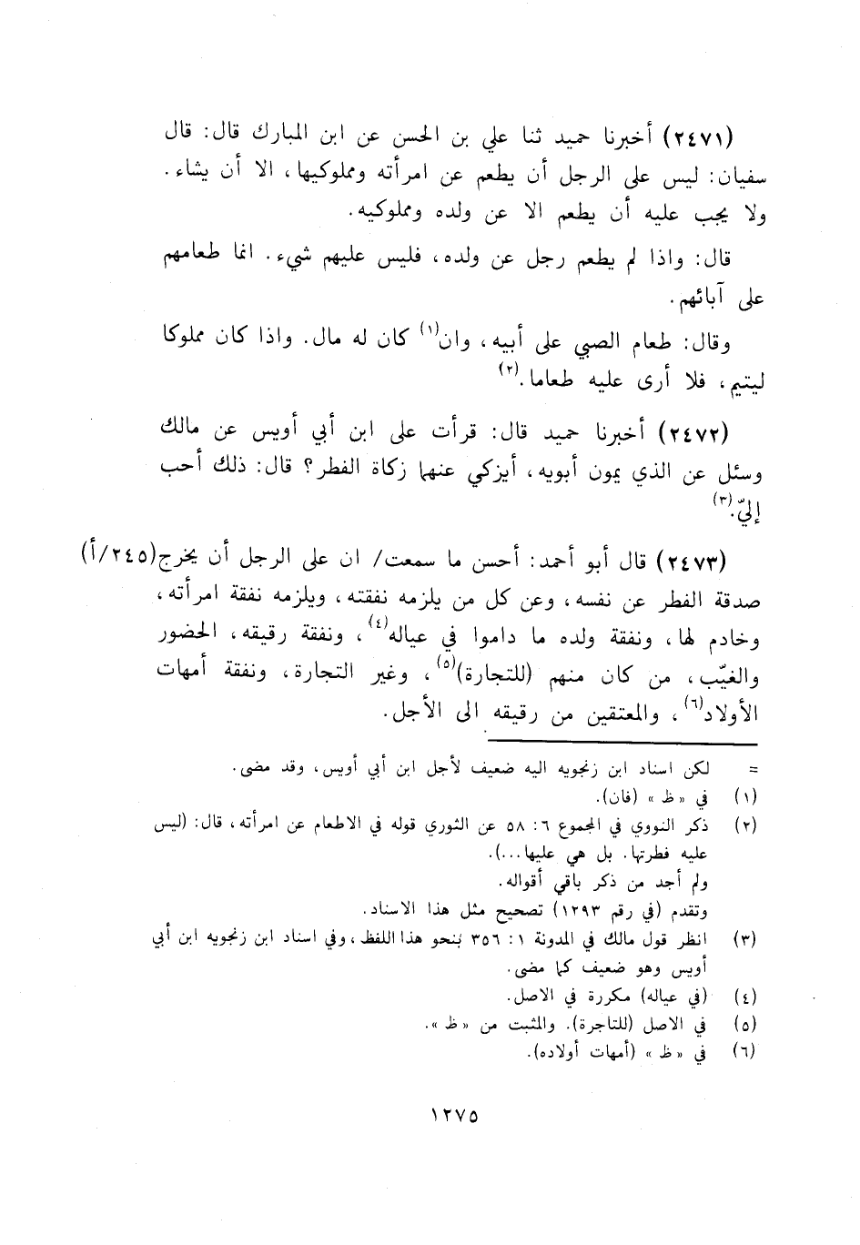 2473 - قَالَ أَبُو أَحْمَدَ: أَحْسَنُ مَا سَمِعْتُ أَنَّ عَلَى الرَّجُلِ أَنْ يُخْرِجَ صَدَقَةَ الْفِطْرِ عَنْ نَفْسِهِ، وَعَنْ كُلِّ مَا يَلْزَمُهُ نَفَقَتُهُ، وَيَلْزَمُهُ نَفَقَةُ امْرَأَتِهِ وَخَادِمٍ لَهَا، وَنَفَقَةِ وَلَدِهِ مَا دَامُوا فِي عِيَالِهِ، وَنَفَقَةِ رَقِيقِهِ، الْحُضُورِ وَالْغُيَّبِ، مَنْ كَانَ مِنْهُمْ لِلتِّجَارَةِ وَغَيْرِ التِّجَارَةِ، وَنَفَقَةِ أُمَّهَاتِ الْأَوْلَادِ، وَالْمُعْتَقِينَ مِنْ رَقِيقِهِ إِلَى الْأَجَلِ