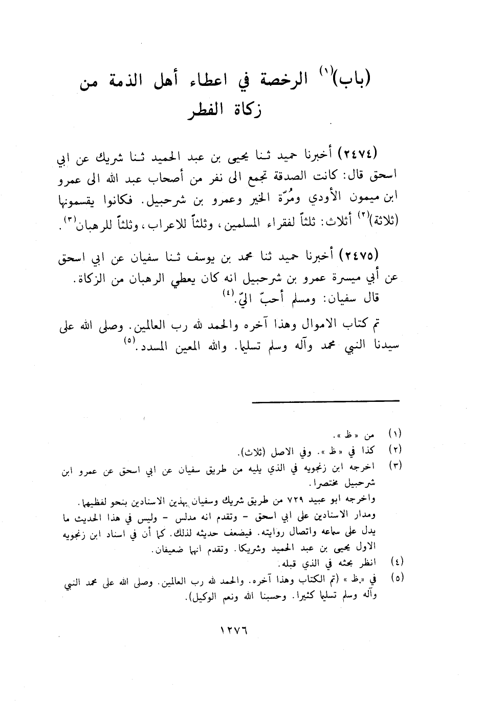 2474 - ثَنَا يَحْيَى بْنُ عَبْدِ الْحَمِيدِ، ثَنَا شَرِيكٌ، عَنْ أَبِي إِسْحَاقَ قَالَ: " كَانَتِ الصَّدَقَةُ تُجْمَعُ إِلَى نَفَرٍ مِنْ أَصْحَابِ عَبْدِ اللَّهِ إِلَى عَمْرِو بْنِ مَيْمُونٍ الْأَوْدِيِّ، وَمُرَّةِ الْخَيْرِ، وَعَمْرِو بْنِ شُرَحْبِيلَ: فَكَانُوا §يَقْسِمُونَهَا ثَلَاثَةَ أَثْلَاثٍ: ثُلُثًا لِفُقَرَاءِ الْمُسْلِمِينَ، وَثُلُثًا لِلْأَعْرَابِ، وَثُلُثًا لِلرُّهْبَانِ "