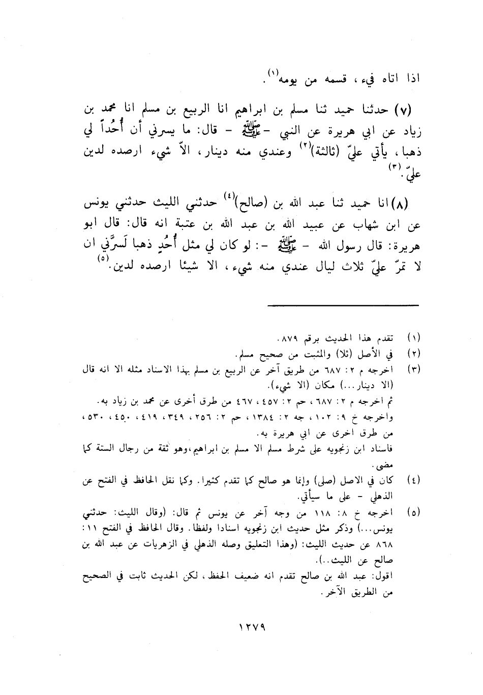 8 - أَنَا حُمَيْدٌ ثَنَا عَبْدُ اللَّهِ بْنُ صَالِحٍ، حَدَّثَنِي اللَّيْثُ، حَدَّثَنِي يُونُسُ، عَنِ ابْنِ شِهَابٍ، عَنْ عُبَيْدِ اللَّهِ بْنِ عَبْدِ اللَّهِ بْنِ عُتْبَةَ أَنَّهُ قَالَ: قَالَ أَبُو هُرَيْرَةَ: قَالَ رَسُولُ اللَّهِ صَلَّى اللهُ عَلَيْهِ وَسَلَّمَ: «§لَوْ كَانَ لِي مِثْلُ أُحُدٍ ذَهَبًا لَسَرَّنِي أَنْ لَا تَمُرَّ عَلَيَّ ثَلَاثُ لَيَالٍ عِنْدِي مِنْهُ شَيْءٌ، إِلَّا شَيْئًا أَرْصُدُهُ لِدَيْنٍ»