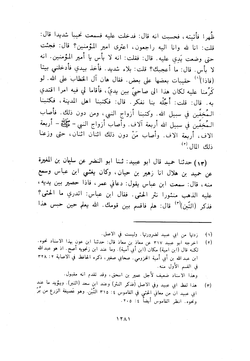 13 - حَدَّثَنَا حُمَيْدٌ قَالَ أَبُو عُبَيْدٍ: ثَنَا أَبُو النَّضْرِ، عَنْ سُلَيْمَانَ بْنِ الْمُغِيرَةِ، عَنْ حُمَيْدِ بْنِ هِلَالٍ، أنا زُهَيْرُ بْنُ حَيَّانَ، وَكَانَ يَغْشَى ابْنَ عَبَّاسٍ وَسَمِعَ مِنْهُ قَالَ: سَمِعْتُ ابْنَ عَبَّاسٍ يَقُولُ: دَعَانِي عُمَرُ، فَإِذَا حَصِيرٌ بَيْنَ يَدَيْهِ، عَلَيْهِ الذَّهَبُ مَنْثُورًا نَثْرَ الْحَثَى، فَقَالَ ابْنُ عَبَّاسٍ: أَتَدْرِي مَا الْحَثَى؟ فَذَكَرَ التِّبْنَ، قَالَ: هَلُمَّ فَاقْسِمْ بَيْنَ قَوْمِكَ، اللَّهُ يَعْلَمُ حِينَ حَبَسَ هَذَا -[1282]- عَنْ نَبِيِّهِ وَعَنْ أَبِي بَكْرٍ وَأَعْطَانِيهِ، أَلْخَيْرَ أَرَادَ بِذَلِكَ أَوِ الشَّرَّ، قَالَ: فَأَكْبَبْتُ أُقَسِّمُ، فَسَمِعْتُ الْبُكَاءَ فَإِذَا هُوَ عُمَرُ يَبْكِي وَيَقُولُ فِي بُكَائِهِ: «§كَلَّا وَالَّذِي بَعَثَهُ بِالْحَقِّ مَا حَبَسَ هَذَا عَنْ نَبِيِّهِ وَعَنْ أَبِي بَكْرٍ إِرَادَةَ الشَّرِّ لَهُمَا وَأَعْطَاهُ عُمَرَ إِرَادَةَ الْخَيْرِ بِهِ» .