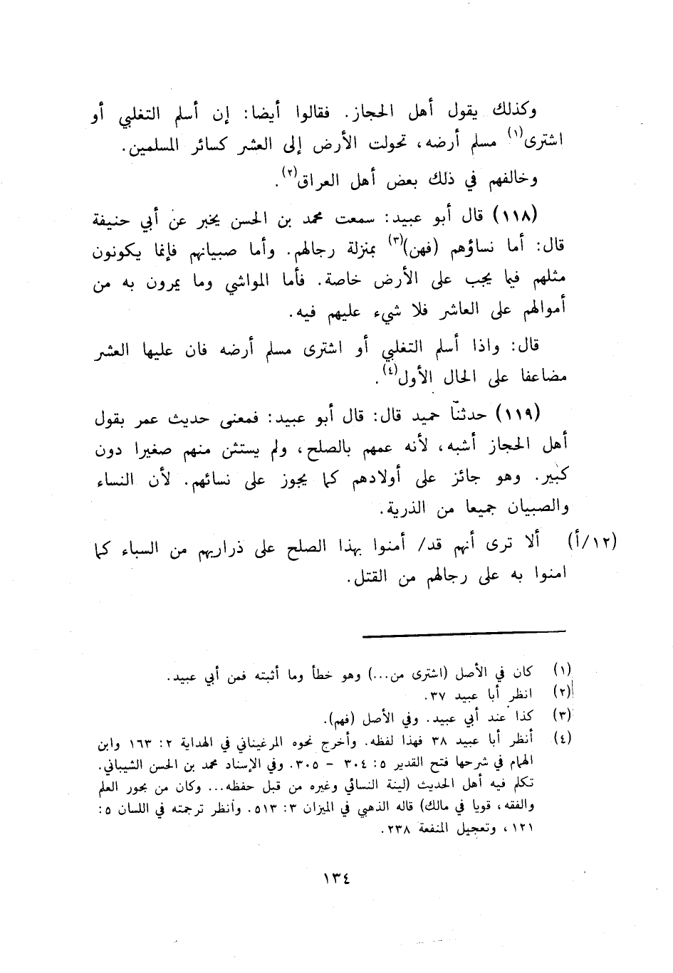 119 - حَدَّثَنَا حُمَيْدٌ قَالَ أَبُو عُبَيْدٍ: فَمَعْنَى حَدِيثُ عُمَرَ بِقَوْلِ أَهْلِ الْحِجَازِ أَشْبُهُ، لِأَنَّهُ عَمَّهُمْ بِالصُّلْحِ، وَلَمْ يَسْتَثْنِ مِنْهُمْ صَغِيرًا دُونَ كَبِيرٍ وَهُوَ جَائِزٌ عَلَى أَوْلَادِهِمْ كَمَا يَجُوزُ عَلَى نِسَائِهِمْ؛ لِأَنَّ النِّسَاءَ وَالصِّبْيَانَ جَمِيعًا مِنَ الذُّرِّيَّةِ أَلَا تَرَى أَنَّهُمْ قَدْ أَمِنُوا بِهَذَا الصُّلْحِ عَلَى ذَرَارِيهِمْ مِنَ السِّبَاءِ كَمَا أَمِنُوا بِهِ عَلَى رِجَالِهِمْ مِنَ الْقَتْلِ -[135]- وَأَمَّا قَوْلُهُمْ فِي أَرْضِهِ، أَنَّهُ إِذَا أَسْلَمَ أَوِ اشْتَرَاهَا مُسْلِمٌ أَنَّهَا تَكُونُ عَلَى حَالِهَا الْأَوَّلِ، فَإِنَّ عَهْدَ رَسُولِ اللَّهِ صَلَّى اللهُ عَلَيْهِ وَسَلَّمَ كَانَ لِلنَّاسِ حِينَ دَعَاهُمْ إِلَى الْإِسْلَامِ غَيْرُ هَذَا، أَلَا تَرَى أَنَّ كُتُبَهُ، إِنَّمَا كَانَتْ تَجْرِي عَلَى النَّاسِ، أَنَّ مَنْ دَخَلَ فِي الْإِسْلَامِ، كَانَ لَهُ مَا لِلْمُسْلِمِينَ، وَعَلَيْهِ مَا عَلَى الْمُسْلِمِينَ فَالْمُسْلِمُونَ فِي هَذَا شَرْعًا سَوَاءٌ وَقَدْ رُوِيَ عَنْ عُمَرَ بْنِ الْخَطَّابِ أَنَّهُ قَالَ لِجَبَلَةَ بْنِ الْأَيْهَمِ مِثْلَ ذَلِكَ. وَهُوَ مِنَ الْعَرَبِ وَكَانَ نَصْرَانِيًّا