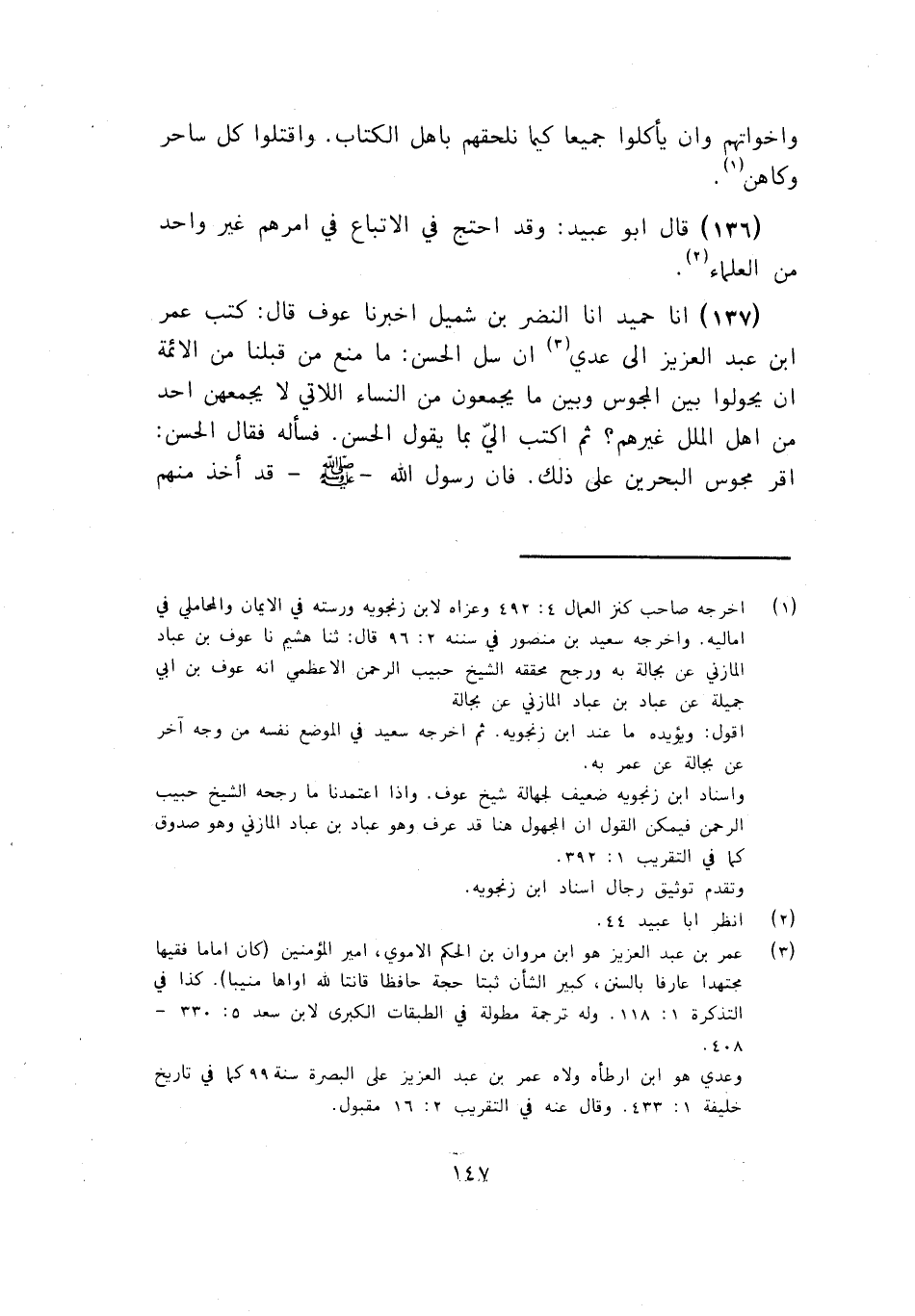 137 - أَنَا حُمَيْدٌ أنا النَّضْرُ بْنُ شُمَيْلٍ، أَخْبَرَنَا عَوْفٌ، قَالَ: كَتَبَ عُمَرُ بْنُ عَبْدِ الْعَزِيزِ، إِلَى عَدِيٍّ، أَنْ سَلِ، الْحَسَنَ: مَا مَنَعَ مَنْ قَبْلَنَا مِنَ الْأَئِمَّةِ أَنْ يَحُولُوا بَيْنَ الْمَجُوسِ وَبَيْنَ مَا يَجْمَعُونَ مِنَ النِّسَاءِ اللَّاتِي لَا يَجْمَعُهُنَّ أَحَدٌ مِنْ أَهْلِ الْمِلَلِ غَيْرُهُمْ؟ ثُمَّ اكْتُبْ إِلَيَّ بِمَا يَقُولُ الْحَسَنُ، فَسَأَلَهُ فَقَالَ الْحَسَنُ: «§أَقَرَّ مَجُوسُ الْبَحْرَيْنِ عَلَى ذَلِكَ، فَإِنَّ رَسُولَ اللَّهِ صَلَّى اللهُ عَلَيْهِ وَسَلَّمَ قَدْ أَخَذَ مِنْهُمُ -[148]- الْجِزْيَةَ، وَكَانُوا عَلَى عَهْدِ أَبِي بَكْرٍ وَعُمَرَ , وَعَامِلُ رَسُولِ اللَّهِ صَلَّى اللهُ عَلَيْهِ وَسَلَّمَ يَوْمَئِذٍ الْعَلَاءُ بْنُ الْحَضْرَمِيُّ»