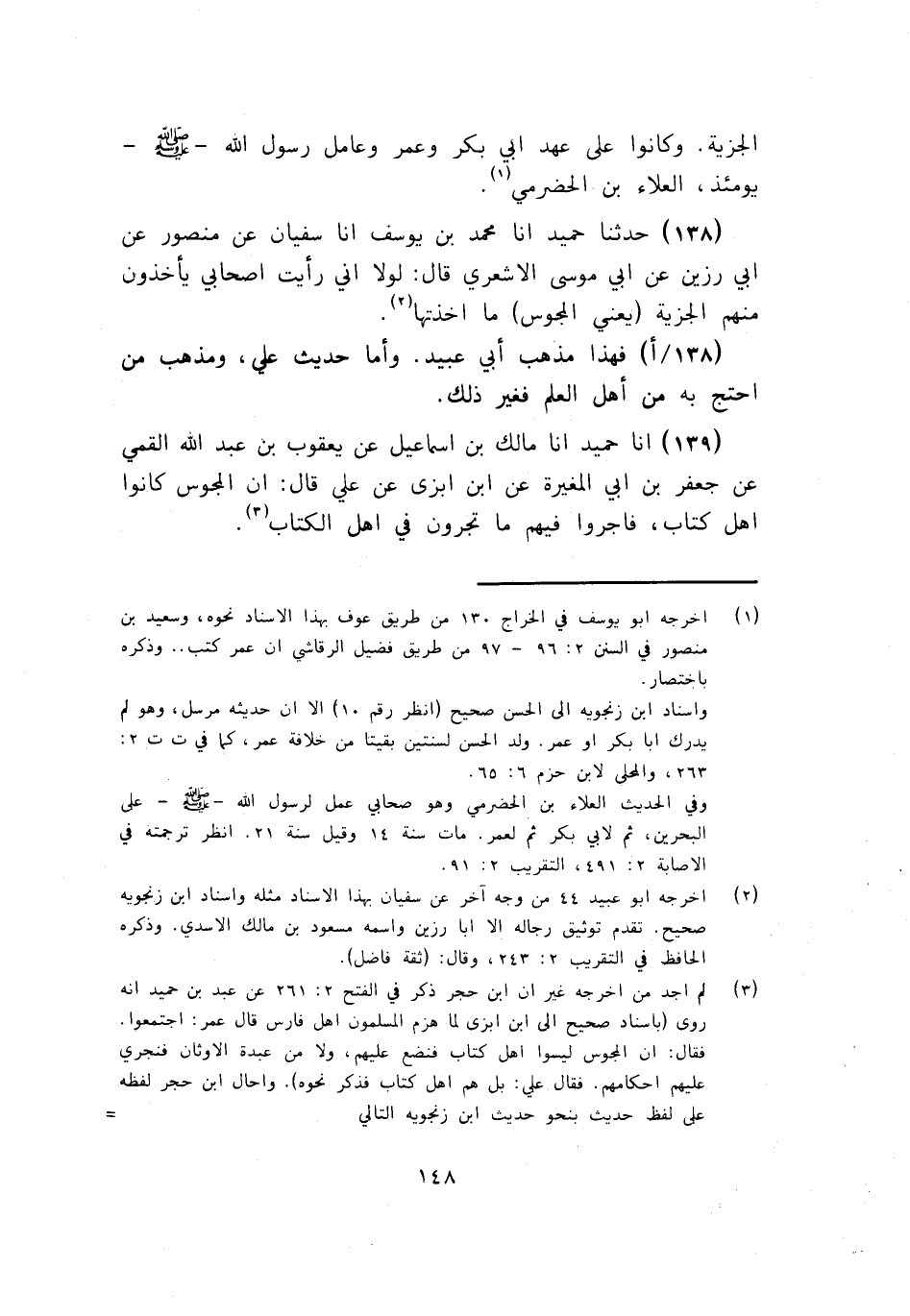 138 - أنا مُحَمَّدُ بْنُ يُوسُفَ، أنا سُفْيَانُ، عَنْ مَنْصُورٍ، عَنْ أَبِي رُزَيْنٍ، عَنْ أَبِي مُوسَى الْأَشْعَرِيِّ، قَالَ: §لَوْلَا أَنِّي رَأَيْتُ أَصْحَابِيَ يَأْخُذُونَ مِنْهُمُ الْجِزْيَةَ، يَعْنِي الْمَجُوسَ مَا أَخَذْتُهَا ". فَهَذَا مَذْهَبُ أَبِي عُبَيْدٍ: وَأَمَّا حَدِيثُ عَلِيٍّ، وَمَذْهَبُ مَنِ احْتَجَّ بِهِ مِنْ أَهْلِ الْعِلْمِ فَغَيْرُ ذَلِكَ