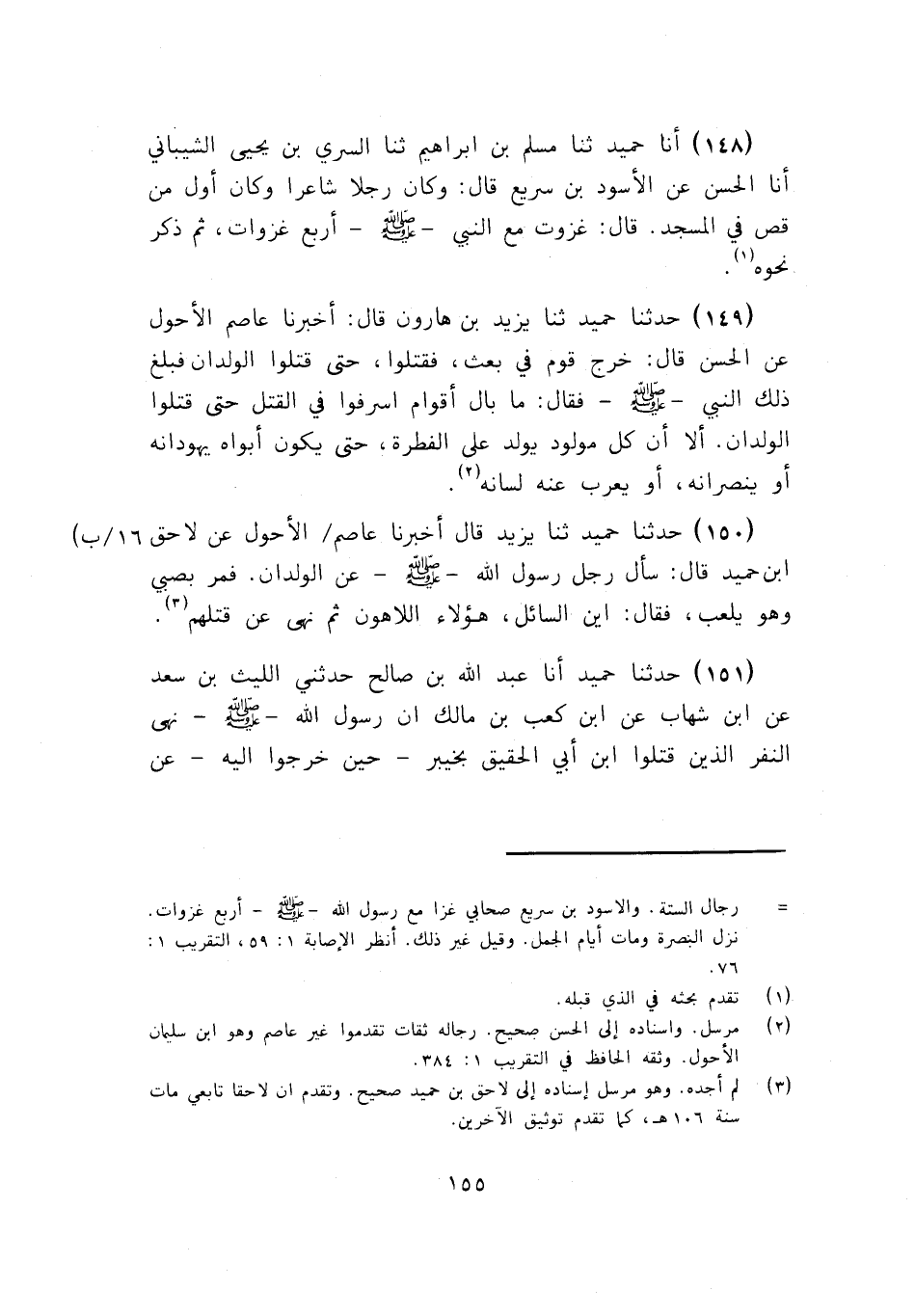 149 - حَدَّثَنَا حُمَيْدٌ، ثنا يَزِيدُ بْنُ هَارُونَ، قَالَ: أَخْبَرَنَا عَاصِمٌ الْأَحْوَلُ، عَنِ الْحَسَنِ، قَالَ: خَرَجَ قَوْمٌ فِي بَعْثٍ فَقَتَلُوا، حَتَّى قَتَلُوا الْوِلْدَانَ فَبَلَغَ ذَلِكَ النَّبِيَّ صَلَّى اللهُ عَلَيْهِ وَسَلَّمَ فَقَالَ: «مَا بَالُ أَقْوَامٍ أَسْرَفُوا فِي الْقَتْلِ حَتَّى قَتَلُوا الْوِلْدَانَ، أَلَا إِنَّ §كُلَّ مَوْلُودٍ يُولَدُ عَلَى الْفِطْرَةِ، حَتَّى يَكُونَ أَبَوَاهُ يُهَوِّدَانِهِ أَوْ يُنَصِّرَانِهِ، أَوْ يُعْرِبُ عَنْهُ لِسَانُهُ»