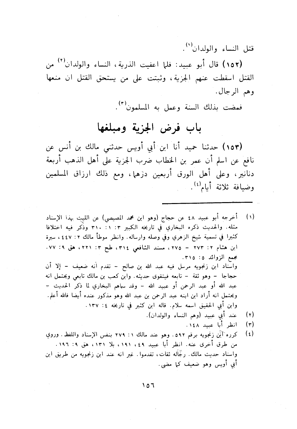 154 - أنا مُحَمَّدُ بْنُ عُبَيْدٍ، أنا عُبَيْدُ اللَّهِ بْنُ عُمَرَ، عَنْ نَافِعٍ، عَنْ أَسْلَمَ، مَوْلَى عُمَرَ، أَنَّ عُمَرَ، كَتَبَ إِلَى أُمَرَاءِ أَهْلِ الْجِزْيَةِ، أَلَّا يَضْرِبُوا الْجِزْيَةَ إِلَّا عَلَى مَنْ جَرَتْ عَلَيْهِ الْمَوَاسِي مِنْهُمْ، §وَجِزْيَتُهُمْ أَرْبَعُونَ دِرْهَمًا عَلَى أَهْلِ الْوَرِقِ مِنْهُمْ وَأَرْبَعَةُ دَنَانِيرٍ عَلَى أَهْلِ الذَّهَبِ. وَعَلَيْهِمْ أَرْزَاقُ الْمُسْلِمِينَ مِنَ الْحِنْطَةِ، مُدَّيْنِ أَوْ مُدَّيْنِ وَثَلَاثَةُ أَقْسَاطِ زَيْتٍ لِكُلِّ إِنْسَانٍ، كُلُّ شَهْرٍ. وَمِنَ الْوَدَكِ وَالْعَسَلِ وَالْكُسْوَةِ، الَّتِي كَانَ أَمِيرُ الْمُؤْمِنِينَ يَكْسُوهَا النَّاسَ، شَيْئًا لَمْ يَحْفَظْهُ عُبَيْدُ اللَّهِ، وَيُضِيفُونَ مَنْ نَزَلَ بِهِمْ مِنْ أَهْلِ الْإِسْلَامِ ثَلَاثَةَ أَيَّامٍ وَعَلَى أَهْلِ الْعِرَاقِ خَمْسَةُ عَشَرَ صَاعًا لِكُلِّ إِنْسَانٍ، قَالَ: وَكَانَ عُمَرُ لَا يَضْرِبُ الْجِزْيَةَ عَلَى النِّسَاءِ وَالصِّبْيَانِ، وَكَانَ يَخْتِمُ، فِي أَعْنَاقِ رِجَالِ أَهْلِ الْجِزْيَةِ
