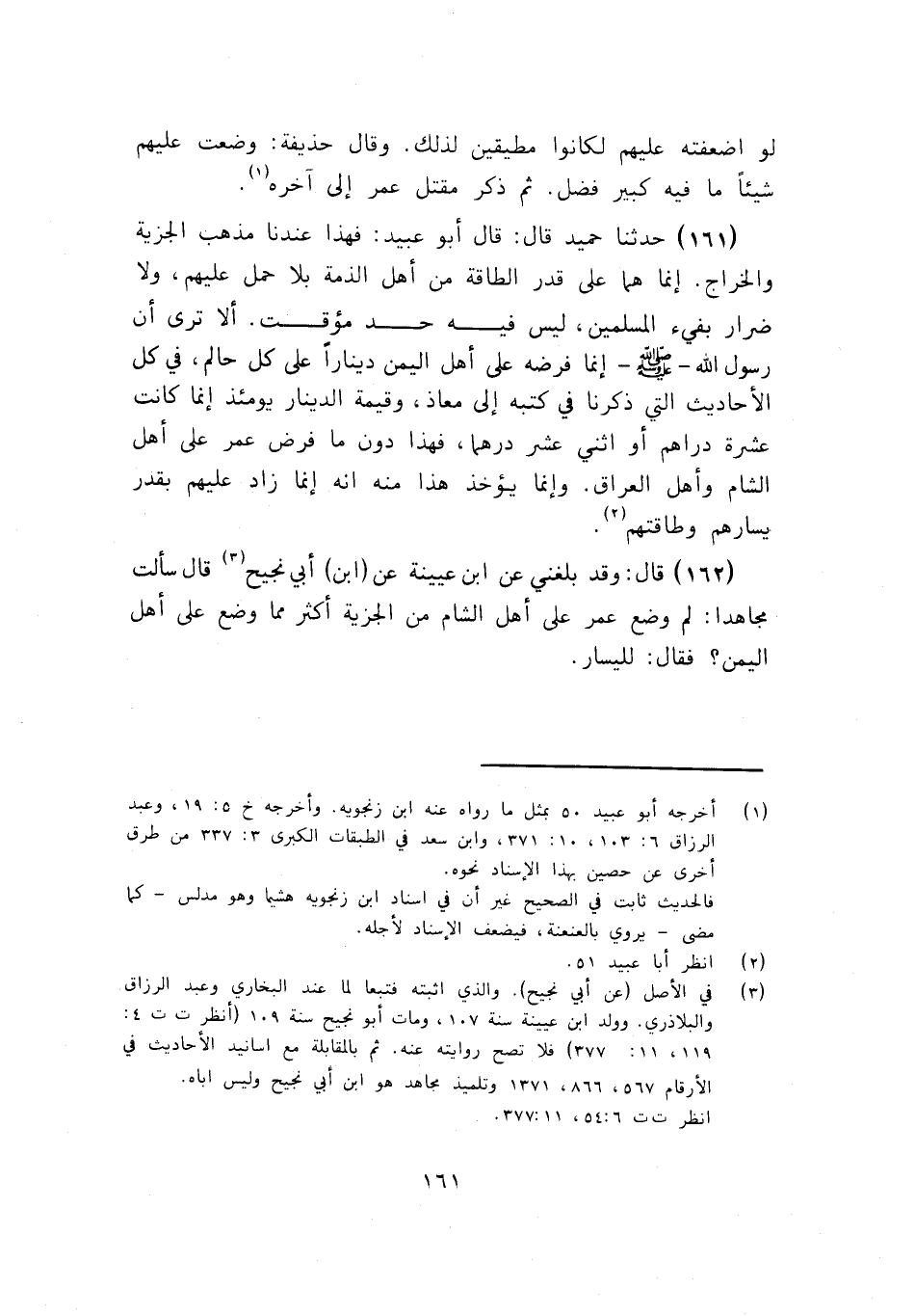 162 - قَالَ: وَقَدْ بَلَغَنِيَ عَنِ ابْنِ عُيَيْنَةَ عَنِ ابْنِ أَبِي نَجِيحٍ، قَالَ: سَأَلْتُ مُجَاهِدًا: لِمَ §وَضَعَ عُمَرُ عَلَى أَهْلِ الشَّامِ، مِنَ الْجِزْيَةِ أَكْثَرَ مِمَّا وَضَعَ عَلَى أَهْلِ الْيَمَنِ؟ فَقَالَ: لَلْيَسَارِ -[162]- قَالَ أَبُو أَحْمَدَ قَالَ أَبُو عُبَيْدٍ: وَحَدَّثَنِيهِ أَبُو نُعَيْمٍ عَنِ ابْنِ عُيَيْنَةَ بِذَلِكَ الْإِسْنِادِ.