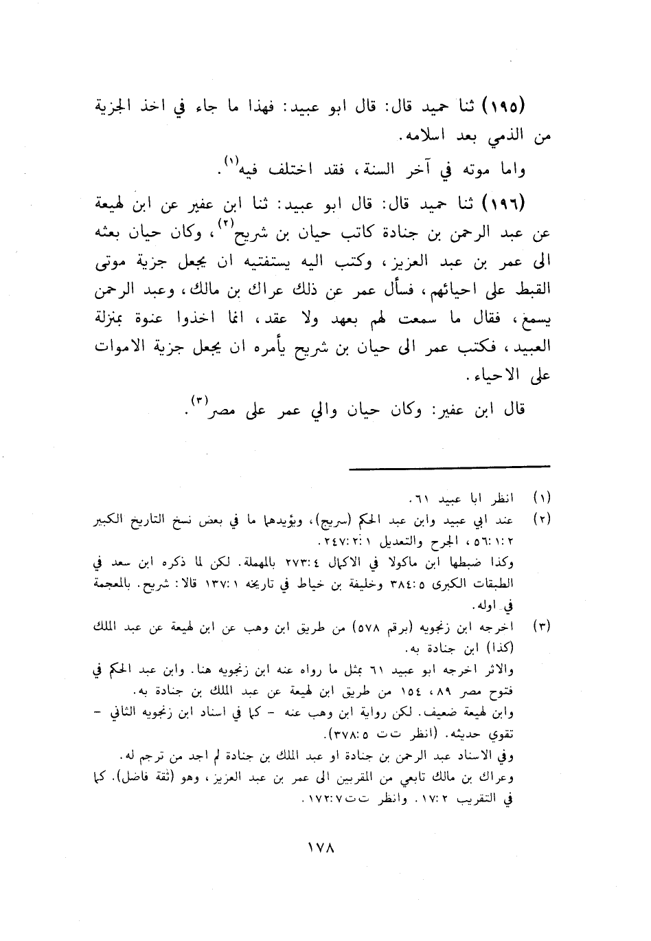 196 - قَالَ أَبُو عُبَيْدٍ: ثنا ابْنُ عُفَيْرٍ، عَنِ ابْنِ لَهِيعَةَ، عَنْ عَبْدِ الرَّحْمَنِ بْنِ جُنَادَةَ، كَاتِبِ حَيَّانَ بْنِ شُرَيْحٍ، وَكَانَ حَيَّانُ بَعَثَهُ إِلَى عُمَرَ بْنِ عَبْدِ الْعَزِيزِ، وَكَتَبَ إِلَيْهِ يَسْتَفْتِيهِ أَنْ يَجْعَلَ جِزْيَةَ مَوْتَى الْقِبْطِ عَلَى أَحْيَائِهِمْ، فَسَأَلَ عُمَرُ عَنْ ذَلِكَ عِرَاكَ بْنَ مَالِكٍ. وَعَبْدُ الرَّحْمَنِ يَسْمَعُ، فَقَالَ: «مَا سَمِعْتُ لَهُمْ بِعَهْدٍ وَلَا عَقْدٍ، إِنَّمَا أُخِذُوا عَنْوَةً بِمَنْزِلَةِ الْعَبِيدِ» ، فَكَتَبَ عُمَرُ إِلَى حَيَّانَ بْنِ شُرَيْحٍ يَأْمُرُهُ أَنْ §يَجْعَلَ جِزْيَةَ الْأَمْوَاتِ عَلَى الْأَحْيَاءِ قَالَ ابْنُ عُفَيْرٍ: وَكَانَ حَيَّانُ وَالِيَ عُمَرَ عَلَى مِصْرَ -[179]-. أَنَا حُمَيْدٌ