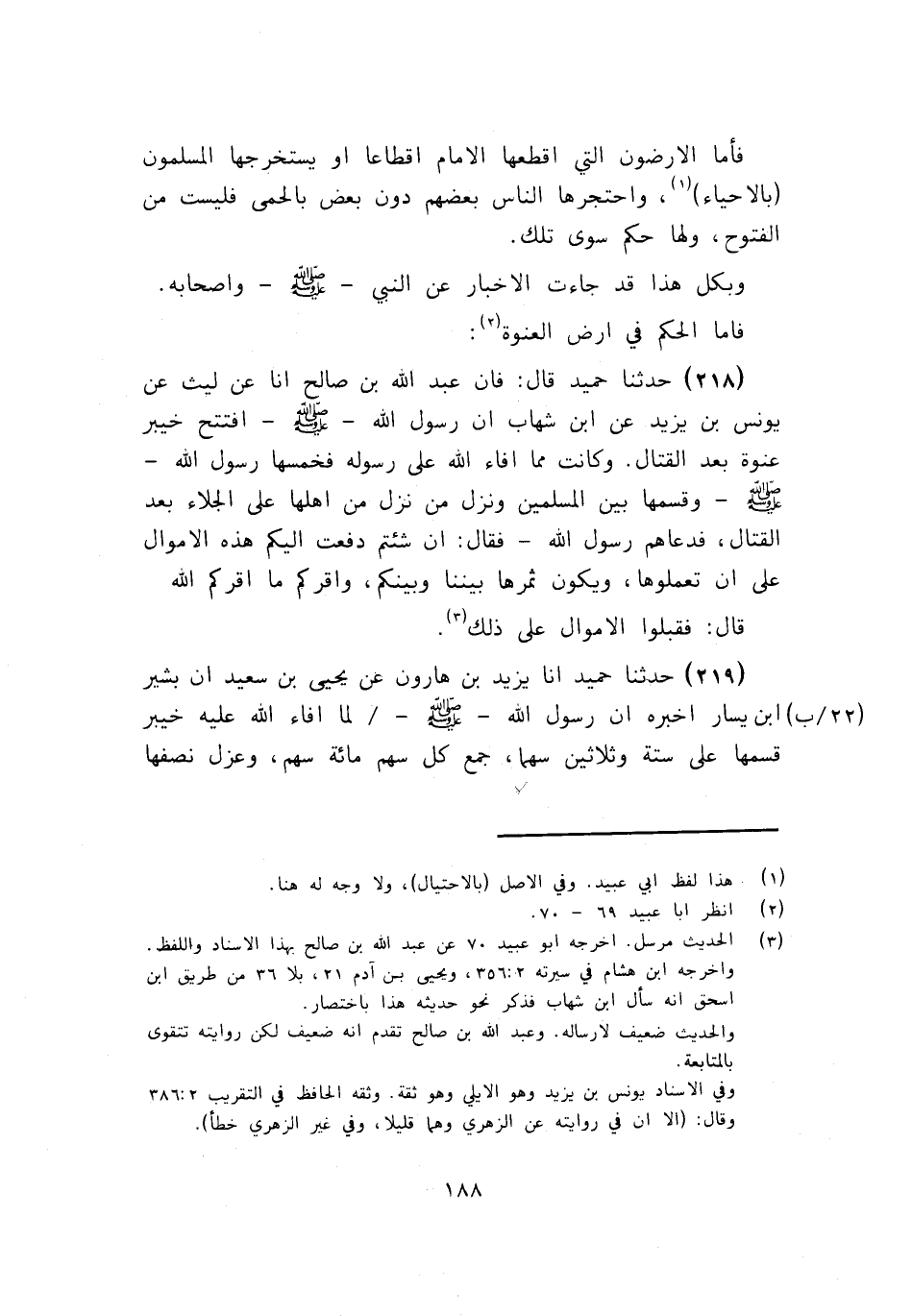 218 - قَالَ فَإِنَّ عَبْدَ اللَّهِ بْنَ صَالِحٍ أنا، عَنْ لَيْثٍ، عَنْ يُونُسَ بْنِ يَزِيدَ، عَنِ ابْنِ شِهَابٍ، أَنَّ رَسُولَ اللَّهِ صَلَّى اللهُ عَلَيْهِ وَسَلَّمَ §افْتَتَحَ خَيْبَرَ عَنْوَةً بَعْدَ الْقِتَالِ، وَكَانَتْ مِمَّا أَفَاءَ اللَّهُ عَلَى رَسُولِهِ فَخَمَّسَهَا رَسُولُ اللَّهِ صَلَّى اللهُ عَلَيْهِ وَسَلَّمَ وَقَسَّمَهَا بَيْنَ الْمُسْلِمِينَ وَنَزَلَ مَنْ نَزَلَ مِنْ أَهْلِهَا عَلَى الْجَلَاءِ بَعْدَ الْقِتَالِ فَدَعَاهُمْ رَسُولُ اللَّهِ فَقَالَ: «إِنْ شِئْتُمْ دَفَعْتُ إِلَيْكُمْ هَذِهِ الْأَمْوَالَ عَلَى أَنْ تَعْمَلُوهَا، وَيَكُونَ ثَمَرُهَا بَيْنَنَا وَبَيْنَكُمْ، وَأُقِرُّكُمْ مَا أَقَرَّكُمُ اللَّهُ» قَالَ: فَقَبَّلُوا الْأَمْوَالَ عَلَى ذَلِكَ
