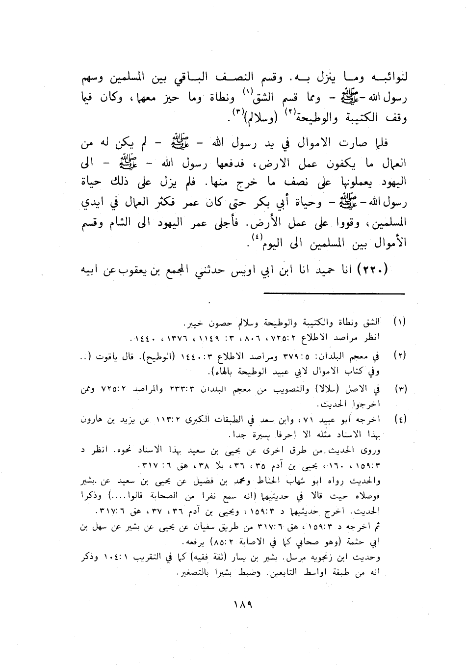 220 - أَنَا حُمَيْدٌ أنا ابْنُ أَبِي أُوَيْسٍ، حَدَّثَنِي الْمُجَمِّعُ بْنُ يَعْقُوبَ، عَنْ أَبِيهِ -[190]-، أَنَّهُ قَالَ: §قُسِمَتْ خَيْبَرُ لِمَنْ شَهِدَ الْحُدَيْبِيَةَ، وَلَمْ يُقَسِّمْ مِنْهَا لِأَحَدٍ شَهِدَ خَيْبَرَ وَلَمْ يَشْهَدِ الْحُدَيْبِيَةَ. قَالَ مُجَمِّعٌ: وَقَالَ أَبِي: قُسِمَتْ خَيْبَرُ عَلَى ثَمَانِيَةَ عَشَرَ سَهْمًا، كُلُّ سَهْمٍ مِائَةُ سَهْمٍ، وَكَانَ أَصْحَابُ الْحُدَيْبِيَةِ أَلْفًا وَخَمْسَمِائَةٍ، فِيهِمْ ثَلَاثُمِائَةِ فَارِسٍ