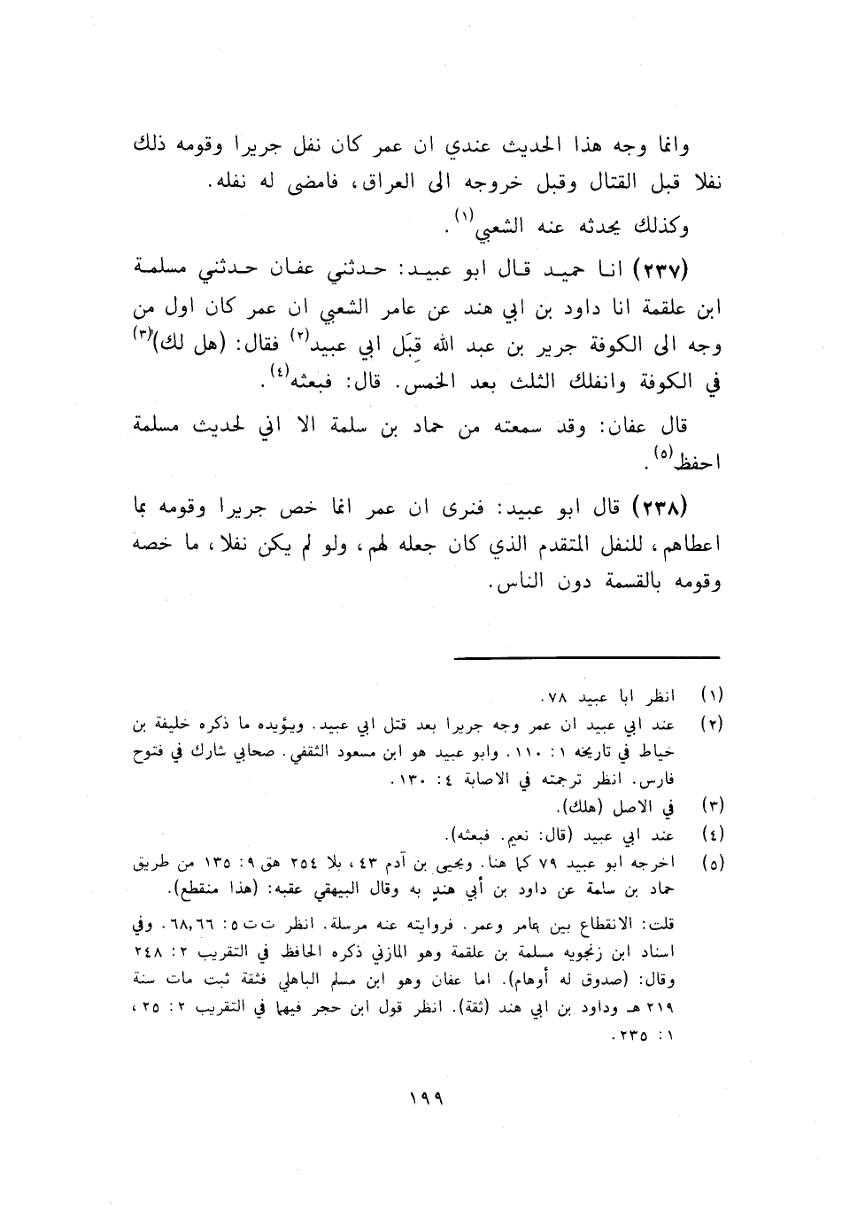 237 - قَالَ أَبُو عُبَيْدٍ: حَدَّثَنِي عَفَّانُ، حَدَّثَنِي مَسْلَمَةُ بْنُ عَلْقَمَةَ، أَنا دَاوُدُ بْنُ أَبِي هِنْدٍ، عَنْ عَامِرٍ الشَّعْبِيِّ، أَنَّ عُمَرَ، كَانَ أَوَّلَ مَنْ وَجَّهَ إِلَى الْكُوفَةِ جَرِيرَ بْنَ عَبْدِ اللَّهِ قِبَلَ أَبِي عُبَيْدٍ: فَقَالَ: «§هَلْ لَكَ فِي الْكُوفَةِ وَأُنْفِلُكَ الثُّلُثَ بَعْدَ الْخُمُسِ» ، قَالَ: فَبَعَثَهُ. قَالَ عَفَّانُ: وَقَدْ سَمِعْتُهُ مِنْ حَمَّادِ بْنِ سَلَمَةَ إِلَّا أَنَّى لِحَدِيثِ مَسْلَمَةَ أَحْفَظُ.