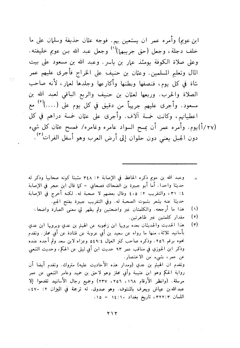 261 - قَالَ الْهَيْثَمُ: وَأَنْبَأَنَا ابْنُ أَبِي لَيْلَى، عَنِ الْحَكَمِ، أَنَّ عُمَرَ كَتَبَ إِلَى عُثْمَانَ بْنِ حُنَيْفٍ، أَنْ «§لَا يَمْسَحَ تَلًّا، وَلَا أَجْمَةً، وَلَا سَبِخَةً، وَلَا مُسْتَنْقَعَ مَاءٍ، وَلَا مَالًا تَبْلُغُهُ الْمِيَاهُ» قَالَ الْهَيْثَمُ: وَأَنْبَأَنَا ابْنُ أَبِي لَيْلَى عَنِ الْحَكَمِ قَالَ: كَانَ ذِرَاعُ عُمَرَ بْنِ الْخَطَّابِ فِي الْمِسَاحَةِ ذِرَاعًا وَقَبْضَةً. قَالَ الْهَيْثَمُ: وَقَبَضَ ابْنُ أَبِي لَيْلَى أَصَابِعَهُ الْأَرْبَعَ، وَرَفَعَ صَدْرَ الْإِبْهَامِ. فَكَتَبَ عُثْمَانُ إِلَى عُمَرَ إِنِّي وَجَدْتُ كُلَّ شَيْءٍ بَلَغَهُ الْمَاءُ، مِنْ عَامِرٍ وَغَامِرٍ سِتَّةً وَثَلَاثِينَ أَلْفَ أَلْفِ جَرِيبٍ. فَكَتَبَ عُمَرُ أَنِ افْرِضْ عَلَيْهِ الْخَرَاجَ عَلَى كُلَّ جَرِيبٍ عَامِرٍ أَوْ غَامِرٍ بَلَغَهُ الْمَاءُ، عَمِلَهُ صَاحِبُهُ أَوْ لَمْ يَعْمَلْهُ، دِرْهَمًا وَقَفِيزًا وَافْرِضْ عَلَى الْكُرُومِ، عَلَى كُلِّ جَرِيبٍ عَشْرَةَ دَرَاهِمَ، وَعَلَى الرِّطَابِ خَمْسَةَ دَرَاهِمَ. وَأَطْعِمَهُمُ النَّخْلَ وَالشَّجَرَ كُلَّهُ. وَقَالَ: هَذَا قُوَّةٌ لَهُمْ عَلَى عِمَارَاتِ بِلَادِهِمْ. وَفَرَضَ عَلَى رِقَابِهِمْ، عَلَى الْمُوسِرِ ثَمَانِيَةً وَأَرْبَعِينَ دِرْهَمًا وَعَلَى مَنْ دُونَ ذَلِكَ أَرْبَعَةً وَعِشْرِينَ دِرْهَمًا، وَعَلَى مَنْ لَمْ يَجِدْ شَيْئًا اثْنَيْ عَشَرَ دِرْهَمًا، وَقَالَ: دِرْهَمٌ لَا يَعُوزُ رَجُلًا فِي كُلِّ شَهْرٍ. وَرَفَعَ عَنْهُمْ عُمَرُ بْنُ الْخَطَّابِ الرِّقَّ بِالْخَرَاجِ الَّذِي وَضَعَهُ عَلَى رِقَابِهِمْ، وَجَعَلَهُمْ أَكَرَةً فِي الْأَرْضِ، فَحُمِلَ مِنْ خَرَاجِ سَوَادِ الْكُوفَةِ فِي أَوَّلِ سَنَةٍ ثَمَانُونَ أَلْفَ أَلْفَ دِرْهَمٍ، ثُمَّ حُمِلَ مِنْ قَابِلٍ عِشْرُونَ وَمِائَةُ أَلْفِ أَلْفِ دِرْهَمٍ، فَلَمْ يَزَلْ الْخَرَاجُ عَلَى ذَلِكَ
