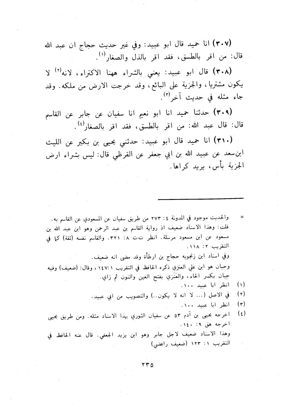 310 - قَالَ أَبُو عُبَيْدٍ: حَدَّثَنِي يَحْيَى بْنُ بُكَيْرٍ، عَنِ اللَّيْثِ بْنِ سَعْدٍ، عَنْ عُبَيْدِ اللَّهِ بْنِ أَبِي جَعْفَرٍ، عَنِ الْقُرَظِيِّ، قَالَ: «§لَيْسَ بِشِرَاءِ أَرْضِ الْجِزْيَةِ بَأْسٌ» ، يُرِيدُ كِرَاهَا -[236]-، قَالَ: وَقَالَ ذَلِكَ أَبُو الزِّنَادِ