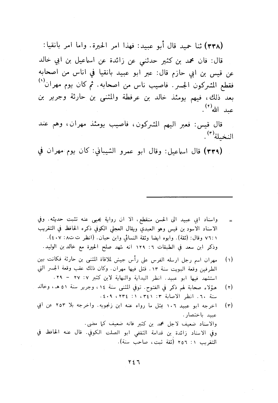 فَإِنَّ مُحَمَّدَ بْنَ كَثِيرٍ حَدَّثَنِي، عَنْ زَائِدَةَ، عَنْ إِسْمَاعِيلَ بْنِ أَبِي خَالِدٍ، عَنْ قَيْسِ بْنِ أَبِي حَازِمٍ، قَالَ: «عَبَرَ أَبُو عُبَيْدٍ بَانِقْيَا فِي أُنَاسٍ مِنْ أَصْحَابِهِ، §فَقَطَعَ الْمُشْرِكُونَ الْجِسْرَ، فَأُصِيبَ نَاسٌ مِنْ أَصْحَابِهِ، ثُمَّ كَانَ يَوْمُ مِهْرَانَ بَعْدَ ذَلِكَ، فِيهِمْ يَوْمَئِذٍ خَالِدُ بْنُ عُرْفُطَةَ وَالْمُثَنَّى بْنُ حَارِثَةَ وَجَرِيرُ بْنُ عَبْدِ اللَّهِ» . قَالَ قَيْسٌ: «فَعَبَرَ إِلَيْهِمُ الْمُشْرِكُونَ، فَأُصِيبَ يَوْمَئِذٍ مِهْرَانُ، وَهُمْ عِنْدَ النُّخَيْلَةِ»