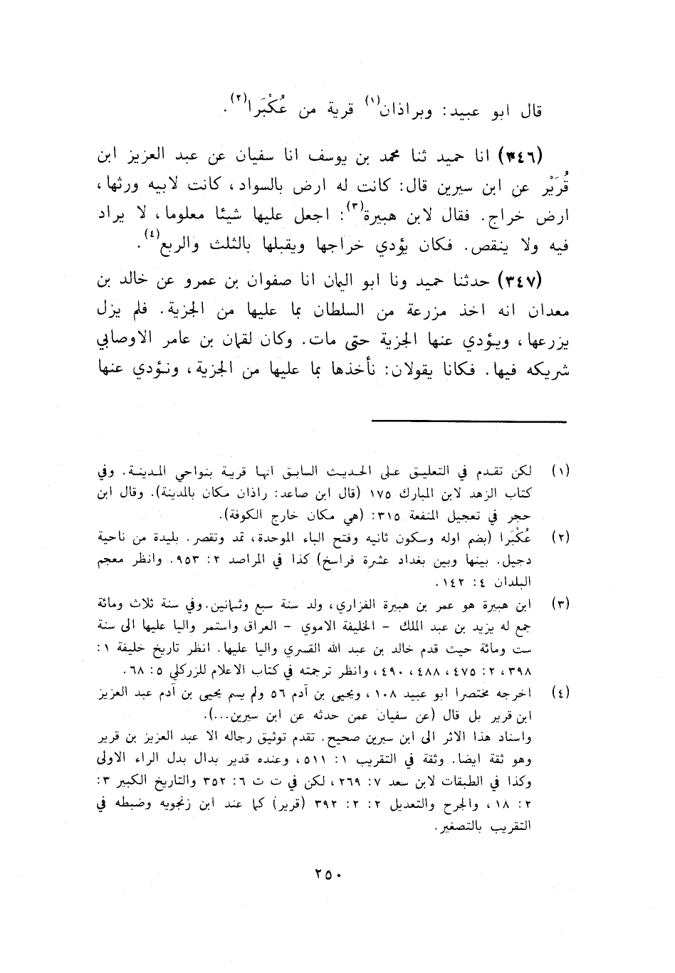 346 - حَدَّثَنَا مُحَمَّدُ بْنُ يُوسُفَ، أنا سُفْيَانُ، عَنْ عَبْدِ الْعَزِيزِ بْنِ قُرَيْرٍ، عَنِ ابْنِ سِيرِينَ، قَالَ: كَانَتْ لَهُ أَرْضٌ بِالسَّوَادِ، كَانَتْ لِأَبِيهِ وَرِثَهَا، أَرْضُ خَرَاجٍ. فَقَالَ لِابْنِ هُبَيْرَةَ: «اجْعَلْ عَلَيْهَا شَيْئًا مَعْلُومًا، لَا يُزَادُ فِيهِ وَلَا يُنْقَصُ» ، §فَكَانَ يُؤَدِّي خَرَاجَهَا وَيَقْبَلُهَا بِالثُّلُثِ وَالرُّبُعِ