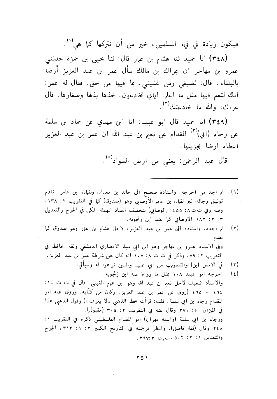 349 - قَالَ أَبُو عُبَيْدٍ: أنا ابْنُ مَهْدِيٍّ، عَنْ حَمَّادِ بْنِ سَلَمَةَ، عَنْ رَجَاءٍ أَبِي الْمِقْدَامِ، عَنْ نُعَيْمِ بْنِ عَبْدِ اللَّهِ، أَنَّ عُمَرَ بْنَ عَبْدِ الْعَزِيزِ، §أَعْطَاهُ أَرْضًا بِجِزْيَتِهَا قَالَ عَبْدُ الرَّحْمَنِ: يَعْنِي مِنْ أَرْضِ السَّوَادِ
