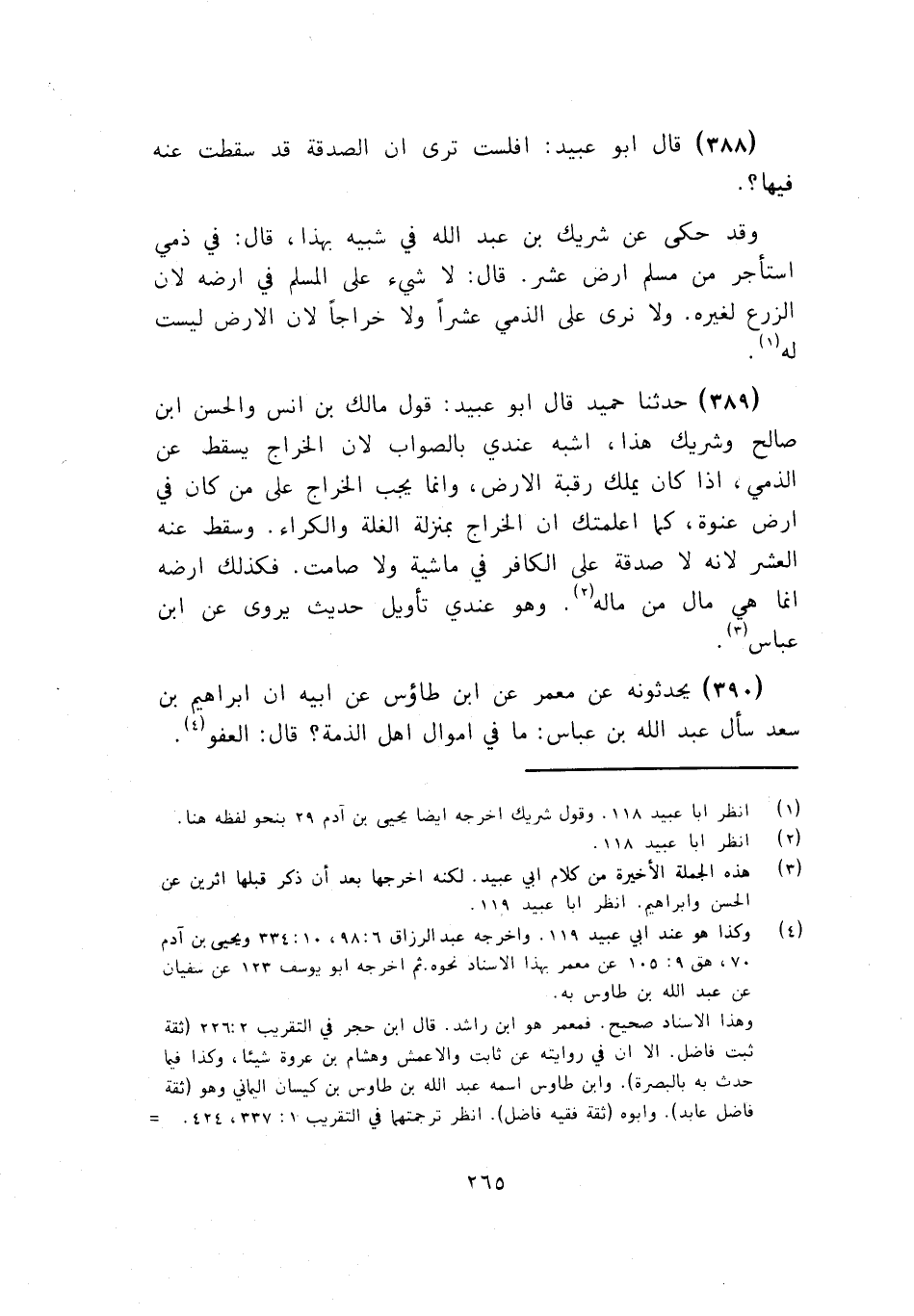 390 - يُحَدِّثُونَهُ عَنْ مَعْمَرٍ، عَنِ ابْنِ طَاوُسٍ، عَنْ أَبِيهِ، أَنَّ إِبْرَاهِيمَ بْنَ سَعْدٍ، سَأَلَ عَبْدَ اللَّهِ بْنَ عَبَّاسٍ: §مَا فِي أَمْوَالِ أَهْلِ الذِّمَّةِ؟ قَالَ: «الْعَفْوُ» -[266]- قَالَ أَبُو عُبَيْدٍ: يُرِيدُ أَنَّهُ قَدْ عُفِيَ لَهُمْ عَنِ الصَّدَقَةِ، وَهَذَا، كَقَوْلِ النَّبِيِّ صَلَّى اللهُ عَلَيْهِ وَسَلَّمَ