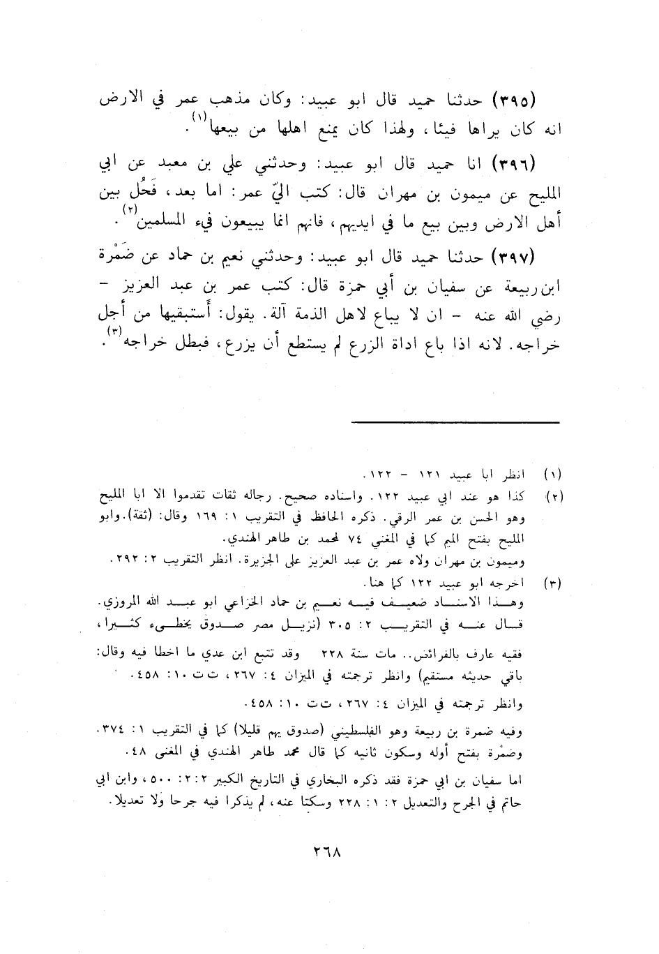 397 - قَالَ أَبُو عُبَيْدٍ: وَحَدَّثَنِي نُعَيْمُ بْنُ حَمَّادٍ، عَنْ ضَمْرَةَ بْنِ رَبِيعَةَ، عَنْ سُفْيَانَ عَنْ أَبِي حَمْزَةَ، قَالَ: كَتَبَ عُمَرُ بْنُ عَبْدِ الْعَزِيزٍ رَضِيَ اللَّهُ عَنْهُ أَنْ " §لَا، يُبَاعَ لِأَهْلِ الذِّمَّةِ آلَةٌ. يَقُولُ: أَسْتَبْقِيهَا مِنْ أَجْلِ خَرَاجِهِ؛ لِأَنَّهُ إِذَا بَاعَ أَدَاةَ الزَّرْعِ لَمْ يَسْتَطِعْ أَنْ يَزْرَعَ، فَبَطُلَ خَرَاجُهُ