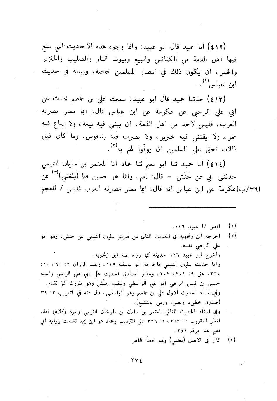 413 - قَالَ أَبُو عُبَيْدٍ: سَمِعْتُ عَلِيَّ بْنَ عَاصِمٍ، يُحَدِّثُ، عَنْ أَبِي عَلِيٍّ الرَّحَبِيِّ، عَنْ عِكْرِمَةَ، عَنِ ابْنِ عَبَّاسٍ، قَالَ: «أَيُّمَا مِصْرٍ مَصَّرَتْهُ الْعَرَبُ، فَلَيْسَ لِأَحَدٍ مِنْ أَهْلِ الذِّمَّةِ، أَنْ يَبْنِيَ فِيهِ بَيْعَةً، §وَلَا يُبَاعُ فِيهِ خَمْرٌ، وَلَا يُقْتَنَى فِيهِ خِنْزِيرٌ، وَلَا يُضْرَبُ فِيهِ بِنَاقُوسٍ. وَمَا كَانَ قَبْلَ ذَلِكَ، فَحَقٌّ عَلَى الْمُسْلِمِينَ أَنْ يُوَفُّوا لَهُمْ بِهِ»
