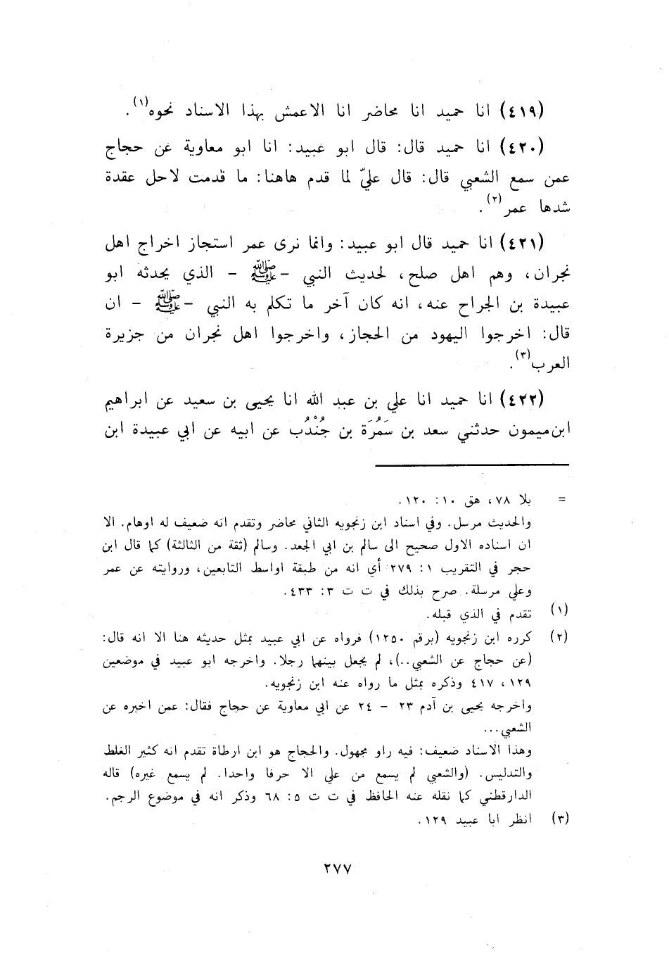 420 - قَالَ أَبُو عُبَيْدٍ: أنا أَبُو مُعَاوِيَةَ، عَنْ حَجَّاجٍ، عَمَّنْ سَمِعَ الشَّعْبِيَّ، قَالَ: قَالَ عَلِيٌّ لَمَّا قَدِمَ هَا هُنَا: «§مَا قَدِمْتُ لِأَحُلَّ عُقْدَةً شَدَّهَا عُمَرُ» ، حَدَّثَنَا حُمَيْدٌ