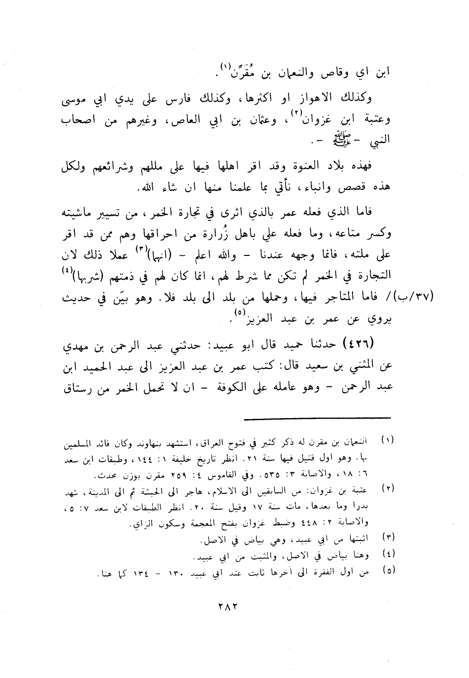 426 - قَالَ أَبُو عُبَيْدٍ: حَدَّثَنِي عَبْدُ الرَّحْمَنِ بْنُ مَهْدِيٍّ، عَنِ الْمُثَنَّى بْنِ سَعِيدٍ، قَالَ: كَتَبَ عُمَرُ بْنُ عَبْدِ الْعَزِيزِ إِلَى عَبْدِ الْحَمِيدِ بْنِ عَبْدِ الرَّحْمَنِ وَهُوَ عَامِلُهُ عَلَى الْكُوفَةِ: أَنْ «§لَا تُحْمَلَ الْخَمْرُ مِنْ رُسْتَاقٍ -[283]- إِلَى رُسْتَاقٍ، وَمَا وَجَدْتَ فِي السُّفُنِ فَصَيِّرْهُ خَلًّا» . فَكَتَبَ عَبْدُ الْحَمِيدِ إِلَى عَامِلِهِ بِوَاسِطَ مُحَمَّدِ بْنِ الْمُنْتَشِرِ بِذَلِكَ. فَأَمَّا السُّفُنُ فَصُبَّ فِي كُلِّ رَاقُودٍ مَاءً وَمِلْحًا فَصَيِّرْهُ خَلًّا. حَدَّثَنَا حُمَيْدٌ
