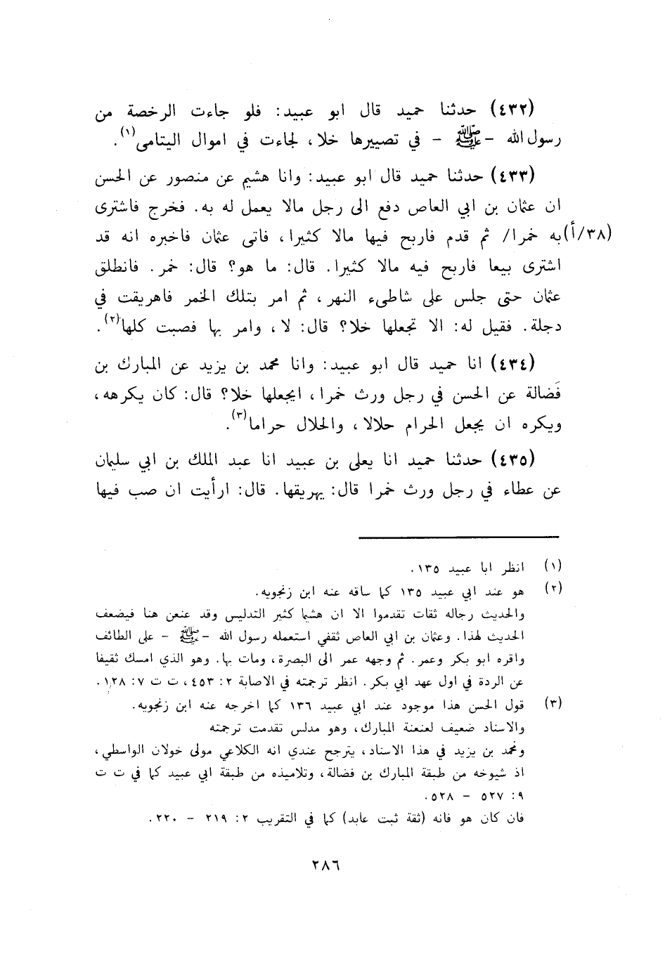 434 - قَالَ أَبُو عُبَيْدٍ: وأنا مُحَمَّدُ بْنُ يَزِيدَ، عَنِ الْمُبَارَكِ بْنِ فَضَالَةَ، عَنِ الْحَسَنِ، §فِي رَجُلٍ وَرِثَ خَمْرًا، أَيَجْعَلُهَا خَلًّا؟ قَالَ: كَانَ يَكْرَهُهُ، وَيَكْرَهُ أَنْ يُجْعَلَ الْحَرَامُ حَلَالًا، وَالْحَلَالُ حَرَامًا