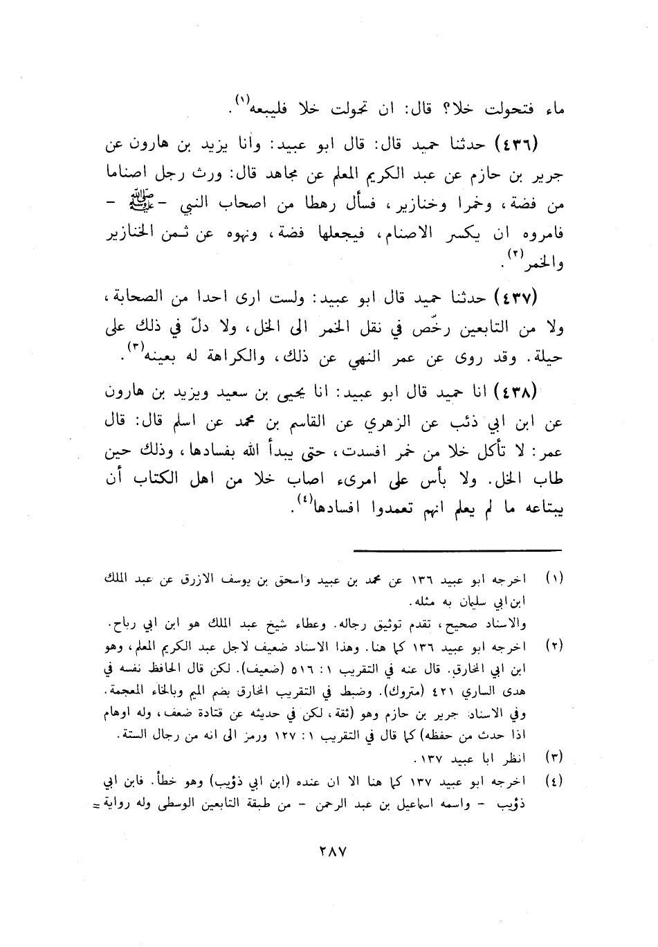 437 - قَالَ أَبُو عُبَيْدٍ: وَلَسْتُ أَرَى أَحَدًا مِنَ الصَّحَابَةِ، وَلَا مِنَ التَّابِعِينَ رَخَّصَ فِي نَقْلِ الْخَمْرِ إِلَى الْخَلِّ، وَلَا دَلَّ فِي ذَلِكَ عَلَى حِيلَةٍ. وَقَدْ رُوِيَ عَنْ عُمَرَ النَّهْيُ عَنْ ذَلِكَ، وَالْكَرَاهَةُ لَهُ بِعَيْنِهِ