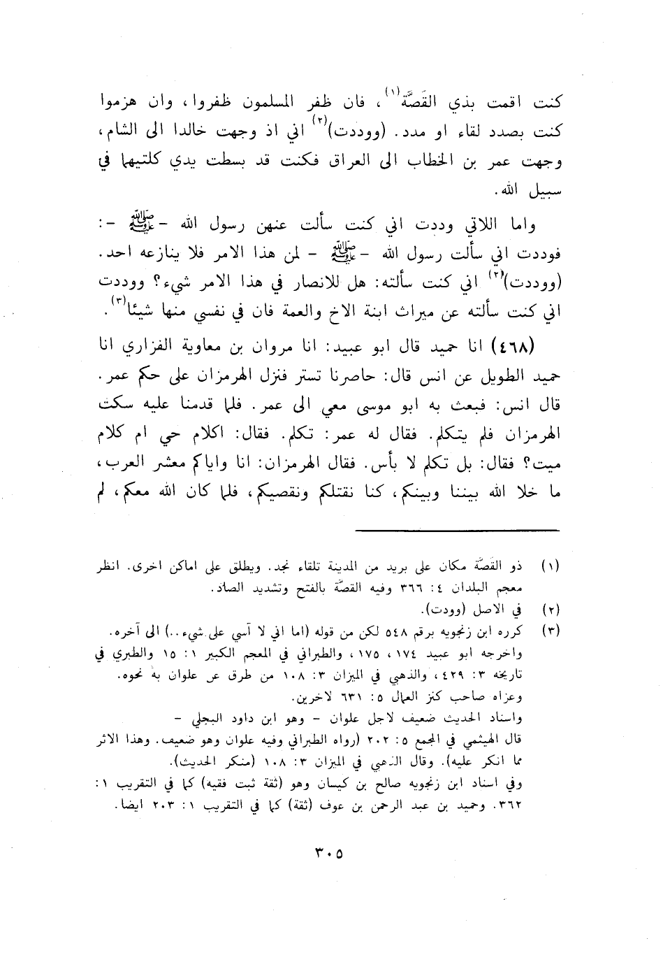 468 - قَالَ أَبُو عُبَيْدٍ: أنا مَرْوَانُ بْنُ مُعَاوِيَةَ الْفَزَارِيُّ، أنا حُمَيْدٌ الطَّوِيلُ، عَنْ أَنَسٍ، قَالَ: حَاصَرْنَا تُسْتَرَ، فَنَزَلَ الْهُرْمُزَانُ عَلَى حُكْمِ عُمَرَ. قَالَ أَنَسٌ: فَبَعَثَ بِهِ أَبُو مُوسَى مَعِي إِلَى عُمَرَ. فَلَمَّا قَدِمْنَا عَلَيْهِ سَكَتَ الْهُرْمُزَانُ، فَلَمْ يَتَكَلَّمْ، فَقَالَ لَهُ عُمَرُ: «تَكَلَّمْ» . فَقَالَ: أَكَلَامُ حَيٍّ أَمْ كَلَامُ مَيِّتٍ؟ فَقَالَ: «بَلْ تَكَلَّمْ لَا بَأْسَ» . فَقَالَ الْهُرْمُزَانُ: إِنَّا وَإِيَّاكُمْ مَعْشَرَ الْعَرَبِ، مَا خَلَا اللَّهَ بَيْنَنَا وَبَيْنَكُمْ، كُنَّا نَقْتُلُكُمْ وَنُقْصِيكُمْ، فَلَمَّا كَانَ اللَّهُ مَعَكُمْ، لَمْ -[306]- يَكُنْ لَنَا بِكُمْ يَدَانِ، فَقَالَ عُمَرُ: «مَا تَقُولُ يَا أَنَسُ» ؟ قَالَ: قُلْتُ: يَا أَمِيرَ الْمُؤْمِنِينَ، §تَرَكْتُ خَلْفِي شَوْكَةً شَدِيدَةً وَعَدُوًّا كَثِيرًا، إِنْ قَتَلْتَهُ يَئِسَ الْقَوْمُ مِنَ الْحَيَاةِ، وَكَانَ أَشَدَّ لِشَوْكَتِهِمْ، وَإِنِ اسْتَحْيَيْتَهُ طَمِعَ الْقَوْمُ، فَقَالَ: «يَا أَنَسُ، أَسْتَحْيِي قَاتِلَ الْبَرَاءِ بْنِ مَالِكٍ وَمَجْزَأَةِ بْنِ ثَوْرٍ؟» ، قَالَ أَنَسٌ: فَلَمَّا خَشِيتُ أَنْ يَبْسُطَ عَلَيْهِ، قُلْتُ: لَيْسَ إِلَى قَتْلِهِ سَبِيلٌ. قَالَ: «لِمَ؟ أَعْطَاكَ؟ أَصَبْتَ مِنْهُ؟» قُلْتُ: مَا فَعَلْتُ، وَلَكِنَّكَ قُلْتَ: تَكَلَّمْ فَلَا بَأْسَ. فَقَالَ عُمَرُ: «لَتُجِيئنِي مَعَكَ بِمَنْ يَشْهَدُ أَوْ لَأَبْدَأَنَّ بِعُقُوبَتِكَ» . قَالَ: فَخَرَجْتُ مِنْ عِنْدِهِ، فَإِذَا الزُّبَيْرُ بْنُ الْعَوَّامِ قَدْ حَفِظَ مَا حَفِظْتُ، قَالَ: فَخَلَّا سَبِيلَهُ. فَأَسْلَمَ الْهُرْمُزَانُ، فَفَرَضَ لَهُ عُمَرُ. أَنَا حُمَيْدٌ