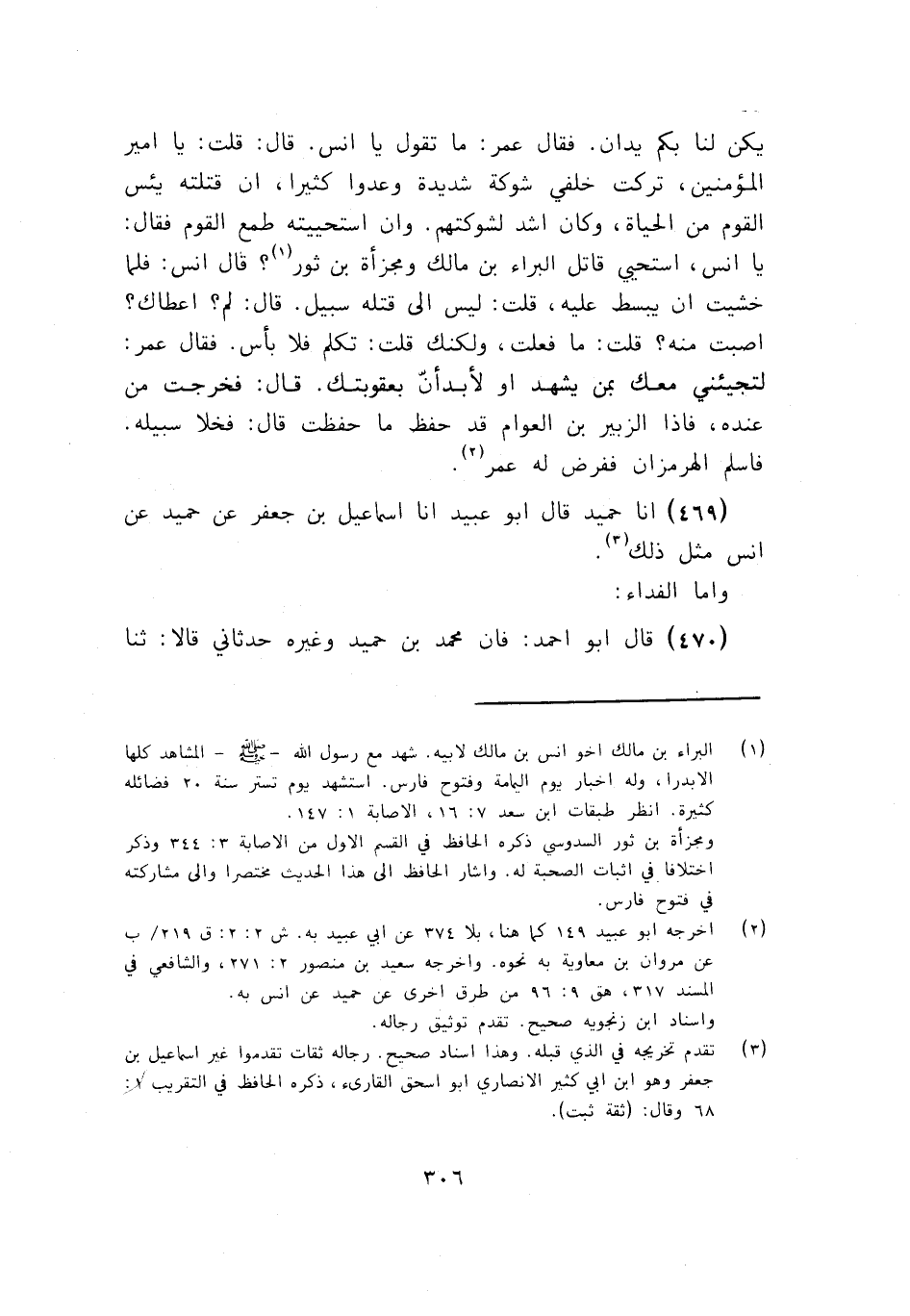 470 - قال: أبو أحمد فَإِنَّ مُحَمَّدَ بْنَ حُمَيْدٍ وَغَيْرَهُ حَدَّثَانِي، قَالَا: ثنا -[307]- جَرِيرٌ، عَنِ الْأَعْمَشِ، عَنْ عَمْرِو بْنِ مُرَّةَ، عَنْ أَبِي عُبَيْدَةَ، عَنْ عَبْدِ اللَّهِ، قَالَ: مَا أَتَى عَلَيَّ يَوْمٌ كَانَ أَظُنَّ عِنْدِي أَنْ أُرْجَمَ فِيهِ بِحِجَارَةٍ مِنَ السَّمَاءِ، مِنْ يَوْمِ بَدْرٍ لَمَّا قُتِلَ مَنْ قُتِلَ، وَأُسِرَ مَنْ أُسِرَ، قَالَ رَسُولُ اللَّهِ صَلَّى اللهُ عَلَيْهِ وَسَلَّمَ: «مَا تَرَوْنَ فِي هَؤُلَاءِ الْأُسْارَى؟» فَقَالَ عَبْدُ اللَّهِ بْنُ رَوَاحَةَ: طَرَدُوكَ وَكَذَّبُوكَ وَقَاتَلُوكَ، وَأَنْتَ فِي وَادٍ كَثِيرِ الْحَطَبِ، فَأَضْرِمِ الْوَادِي عَلَيْهِمْ نَارًا. فَقَالَ الْعَبَّاسُ: قَطَعَ اللَّهُ رَحِمَكَ، فَقَالَ عُمَرُ: كَذَّبُوكَ وَقَاتَلُوكَ، وَطَرَدُوكَ، فَاضْرِبْ أَعْنَاقَهُمْ. . فَقَالَ أَبُو بَكْرٍ: عَشِيرَتُكَ وَقَوْمُكَ يَا نَبِيَّ اللَّهِ تَجَاوَزْ عَنْهُمْ لَعَلَّ اللَّهَ أَنْ يَسْتَنْقِذَهُمُ بِكَ مِنَ النَّارِ، فَلَمْ يُحِرْ إِلَيْهِمْ شَيْئًا، ثُمَّ قَامَ فَدَخَلَ، فَلَمَّا صَلَّى الظُّهْرَ، قَالَ: " إِنَّ مَثَلَ هَؤُلَاءِ كَمَثَلِ أُخْوَةٍ لَهُمْ مَضَوْا قَبْلَهُمْ، قَالَ نُوحٌ: {رَبِّ لَا تَذَرْ عَلَى الْأَرْضِ مِنَ الْكَافِرِينَ دَيَّارًا} [نوح: 26] وَقَالَ مُوسَى: {رَبَّنَا إِنَّكَ آتَيْتَ فِرْعَوْنَ وَمَلَأَهُ زِينَةً وَأَمْوَالًا فِي الْحَيَاةِ الدُّنْيَا رَبَّنَا لِيُضِلُّوا عَنْ سَبِيلِكَ رَبَّنَا اطْمِسْ عَلَى أَمْوَالِهِمْ وَاشْدُدْ عَلَى قُلُوبِهِمْ فَلَا يُؤْمِنُوا حَتَّى يَرَوُا الْعَذَابَ الْأَلِيمَ} [يونس: 88] وَقَالَ إِبْرَاهِيمُ: {فَمَنْ تَبِعَنِي فَإِنَّهُ مِنِّي وَمَنْ عَصَانِي فَإِنَّكَ غَفُورٌ رَحِيمٌ} [إبراهيم: 36] . وَقَالَ عِيسَى: {إِنْ تُعَذِّبْهُمْ فَإِنَّهُمْ عِبَادُكَ وَإِنْ تَغْفِرْ لَهُمْ فَإِنَّكَ أَنْتَ الْعَزِيزُ الْحَكِيمُ} [المائدة: 118] ، وَإِنَّ اللَّهَ لَيُشْدِدْ بِهَذَا الدِّينِ قُلُوبَ أَقْوَامٍ حَتَّى تَكُونَ أَشَدَّ مِنَ الْحَدِيدِ، وَيُلِينَ لَهُ قُلُوبَ أَقْوَامٍ حَتَّى تَكُونَ أَلْيَنَ مِنَ -[308]- اللِّينِ، وَلَكِنْ §لَا يَنْفَلِتُ أَحَدٌ مِنْهُمْ إِلَّا بِفِدَاءٍ، أَوْ ضَرْبِ عُنُقٍ "، فَقُلْتُ: يَا رَسُولَ اللَّهِ، إِلَّا سُهَيْلَ بْنَ الْبَيْضَاءِ، فَإِنِّي سَمِعْتُهُ يَذْكُرُ الْإِسْلَامَ بِمَكَّةَ، ثُمَّ نَظَرْتُ إِلَى السَّمَاءِ وَخَشِيتُ أَنْ أُرْجَمَ، حَتَّى قَالَ النَّبِيُّ صَلَّى اللهُ عَلَيْهِ وَسَلَّمَ: «إِلَّا سُهَيْلَ بْنَ الْبَيْضَاءِ»