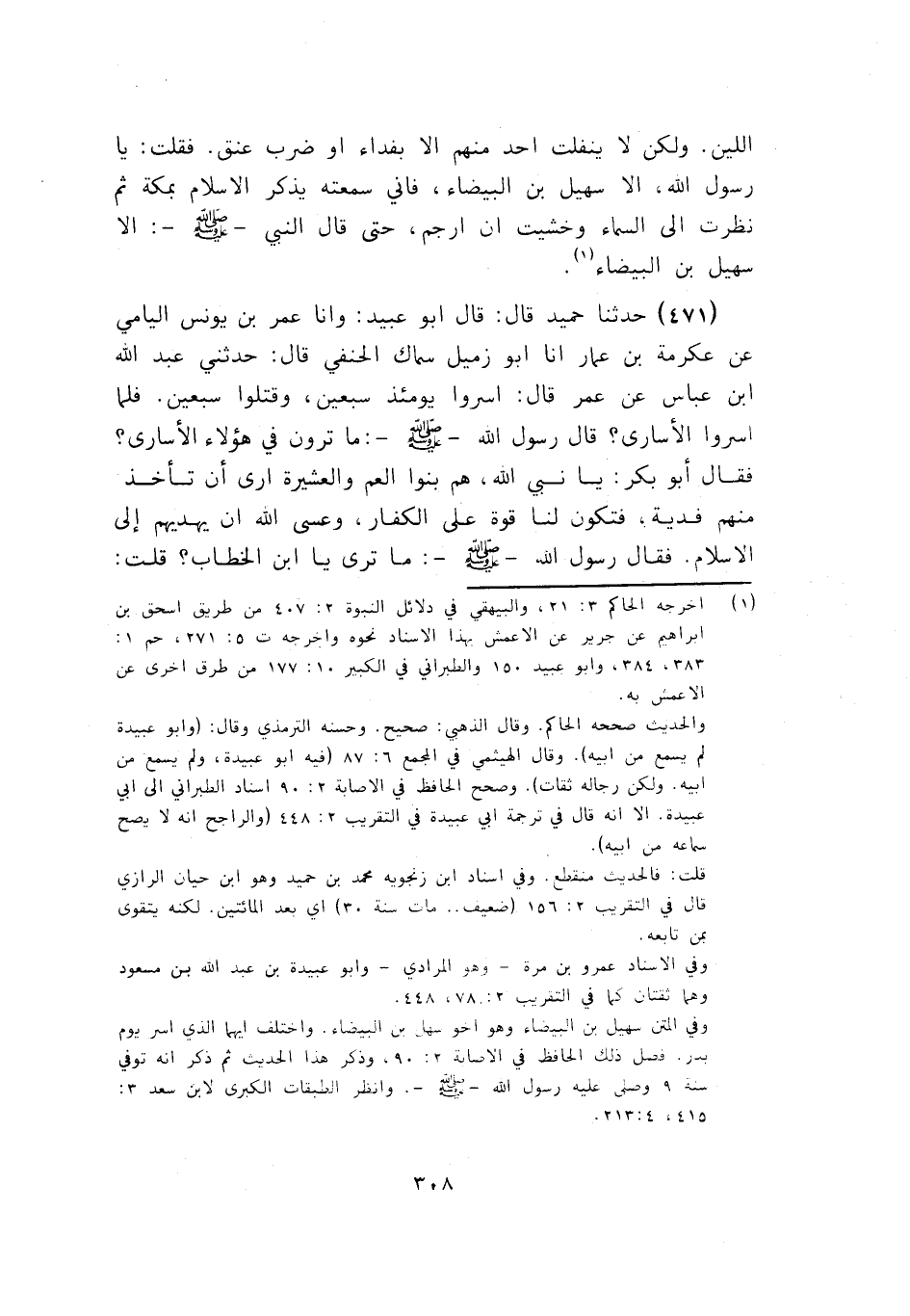 471 - قَالَ أَبُو عُبَيْدٍ: وَأَنَا عُمَرُ بْنُ يُونُسَ الْيَامِيُّ، عَنْ عِكْرِمَةَ بْنِ عَمَّارٍ، أنا أَبُو زُمَيْلٍ سِمَاكٌ الْحَنَفِيُّ، قَالَ: حَدَّثَنِي عَبْدُ اللَّهِ بْنُ عَبَّاسٍ، عَنْ عُمَرَ، قَالَ: أَسَرُوا يَوْمَئِذٍ سَبْعِينَ، وَقَتَلُوا سَبْعِينَ، فَلَمَّا أَسَرُوا الْأُسَارَى؟ قَالَ رَسُولُ اللَّهِ صَلَّى اللهُ عَلَيْهِ وَسَلَّمَ: «مَا تَرَوْنَ فِي هَؤُلَاءِ الْأُسَارَى؟» فَقَالَ أَبُو بَكْرٍ: يَا نَبِيَّ اللَّهِ، هُمْ بَنُو الْعَمِّ وَالْعَشِيرَةِ أَرَى أَنْ تَأْخُذَ مِنْهُمْ فِدْيَةً، فَتَكُونَ لَنَا قُوَّةً عَلَى الْكُفَّارِ، وَعَسَى اللَّهُ أَنْ يَهْدِيَهُمُ إِلَى الْإِسْلَامِ، فَقَالَ رَسُولُ اللَّهِ صَلَّى اللهُ عَلَيْهِ وَسَلَّمَ: «مَا تَرَى يَا ابْنَ الْخَطَّابِ؟» قُلْتُ -[309]-: لَا وَاللَّهِ يَا رَسُولَ اللَّهِ، مَا أَرَى الَّذِي رَأَى أَبُو بَكْرٍ، يَا نَبِيَّ اللَّهِ، وَلَكِنْ أَرَى أَنْ تُمَكِّنَّا مِنْهُمْ، فَنَضْرِبَ أَعْنَاقَهُمْ، فَتُمَكِّنَ عَلِيًّا مِنْ عَقِيلٍ، فَيَضْرِبَ عُنُقَهُ، وَتُمَكِّنِّي مِنْ فُلَانٍ نَسِيبٍ لِعُمَرَ، فَاضْرِبَ عُنُقَهُ، فَإِنَّ هَؤُلَاءِ أَئِمَّةُ الْكُفْرِ وَصَنَادِيدُهُ. قَالَ: فَهَوِيَ رَسُولُ اللَّهِ صَلَّى اللهُ عَلَيْهِ وَسَلَّمَ مَا قَالَ أَبُو بَكْرٍ، وَلَمْ يَهْوِ مَا قُلْتُ. فَلَمَّا كَانَ مِنَ الْغَدِ، جِئْتُ إِلَى رَسُولِ اللَّهِ صَلَّى اللهُ عَلَيْهِ وَسَلَّمَ وَأَبِي بَكْرٍ قَاعِدَيْنِ يَبْكِيَانِ، فَقُلْتُ يَا رَسُولَ اللَّهِ، أَخْبِرْنِي مِنْ أَيِّ شَيْءٍ تَبْكِي أَنْتَ وَصَاحِبُكَ؟ فَإِنْ وَجَدْتُ بُكَاءً بَكَيْتُ، وَإِنْ لَمْ أَجِدْ بُكَاءً تَبَاكَيْتُ لِبُكَائِكُمَا. فَقَالَ رَسُولُ اللَّهِ صَلَّى اللهُ عَلَيْهِ وَسَلَّمَ: «أَبْكِي لِلَّذِي عَرَضَ عَلَيَّ أَصْحَابِي مِنْ أَخْذِهِمُ الْفِدَاءَ، لَقَدْ §عُرِضَ عَلَيَّ عَذَابُكُمْ أَدْنَى مِنْ هَذِهِ الشَّجَرَةِ» ، شَجَرَةٍ قَرِيبَةٍ مِنْ نَبِيِّ اللَّهِ صَلَّى اللهُ عَلَيْهِ وَسَلَّمَ، وَأَنْزَلَ اللَّهُ تَبَارَكَ وَتَعَالَى: {مَا كَانَ لِنَبِيٍّ أَنْ يَكُونَ لَهُ أَسْرَى حَتَّى يُثْخِنَ فِي الْأَرْضِ} [الأنفال: 67] إِلَى قَوْلِهِ: {فَكُلُوا مِمَّا غَنِمْتُمْ حَلَالًا طَيِّبًا} [الأنفال: 69] فَأَحَلَّ اللَّهُ الْغَنِيمَةَ لَهُمْ