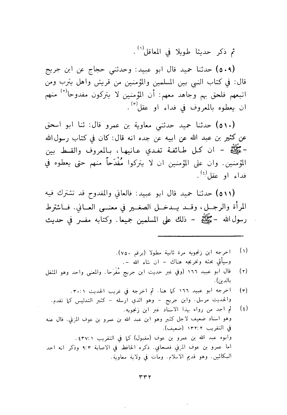509 - قَالَ أَبُو عُبَيْدٍ: وَحَدَّثَنِي حَجَّاجٌ، عَنِ ابْنِ جُرَيْجٍ، قَالَ: فِي كِتَابِ النَّبِيِّ بَيْنَ الْمُسْلِمِينَ، وَالْمُؤْمِنِينَ مِنْ قُرَيْشٍ وَأَهْلِ يَثْرِبَ، وَمَنِ اتَّبَعَهُمْ، فَلَحِقَ بِهِمْ وَجَاهَدَ مَعَهُمْ: أَنَّ §الْمُؤْمِنِينَ لَا يَتْرُكُونَ مَفْدُوحًا مِنْهُمْ أَنْ يُعْطُوهُ بِالْمَعْرُوفِ فِي فِدَاءٍ أَوْ عَقْلٍ