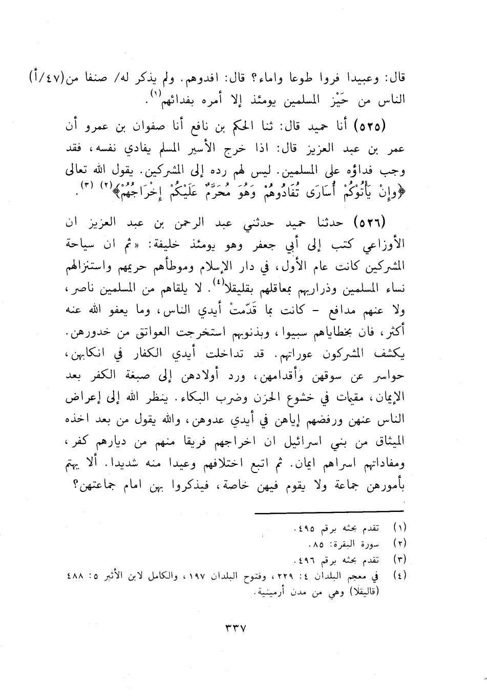 525 - ثنا الْحَكَمُ بْنُ نَافِعٍ، أنا صَفْوَانُ بْنُ عَمْرٍو، أَنَّ عُمَرَ بْنَ عَبْدِ الْعَزِيزِ، قَالَ: " §إِذَا خَرَجَ الْأَسِيرُ الْمُسْلِمُ يُفَادِي نَفْسَهُ، فَقَدْ وَجَبَ فِدَاؤُهُ عَلَى الْمُسْلِمِينَ لَيْسَ لَهُمْ رَدُّهُ إِلَى الْمُشْرِكِينَ، يَقُولُ اللَّهُ تَعَالَى: {وَإِنْ يَأْتُوكُمْ أُسَارَى تُفَادُوهُمْ وَهُوَ مُحَرَّمٌ عَلَيْكُمْ إِخْرَاجُهُمْ} [البقرة: 85] "