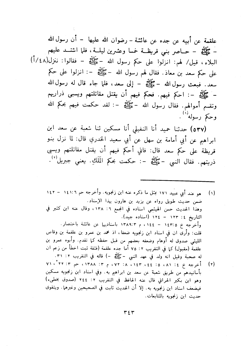 537 - أنا النُّفَيْلِيُّ، أنا مِسْكِينٌ، ثنا شُعْبَةُ، عَنْ سَعْدِ بْنِ إِبْرَاهِيمَ، عَنْ أَبِي أُمَامَةَ بْنِ سَهْلٍ، عَنْ أَبِي سَعِيدٍ الْخُدْرِيِّ، قَالَ: لَمَّا نَزَلَ بَنُو قُرَيْظَةَ عَلَى حُكْمِ سَعْدٍ، قَالَ: فَإِنِّي أَحْكُمُ فِيهِمْ أَنْ يُقْتَلَ مُقَاتِلَتُهُمْ وَيُسْبَى ذُرِّيَّتُهُمْ، فَقَالَ النَّبِيُّ صَلَّى اللهُ عَلَيْهِ وَسَلَّمَ: «§حَكَمْتَ بِحُكْمِ الْمَلَكِ» يَعْنِي جِبْرِيلَ