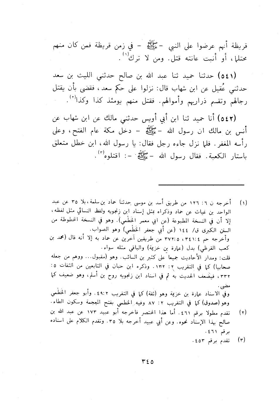 541 - ثنا عَبْدُ اللَّهِ بْنُ صَالِحٍ، حَدَّثَنِي اللَّيْثُ بْنُ سَعْدٍ، حَدَّثَنِي عُقَيْلٌ، عَنِ ابْنِ شِهَابٍ، قَالَ: «§نَزَلُوا عَلَى حُكْمِ سَعْدٍ، فَقَضَى بِأَنْ يُقْتَلَ رِجَالُهُمْ وَتُقَسَّمَ ذَرَارِيُّهُمْ، وَأَمْوَالُهُمْ. فَقُتِلَ مِنْهُمْ يَوْمَئِذٍ كَذَا وَكَذَا»