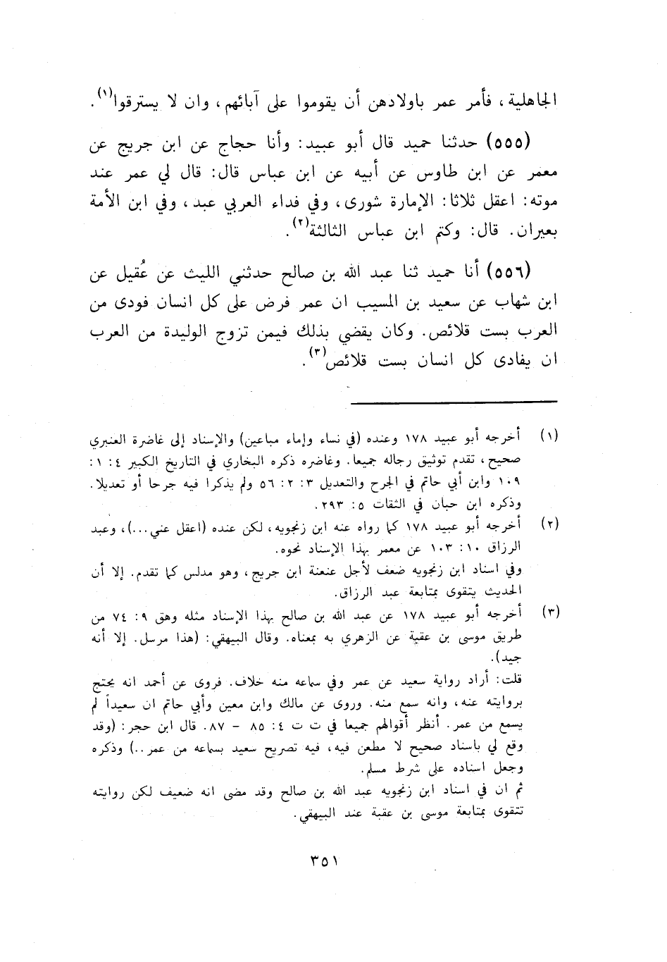 555 - قَالَ أَبُو عُبَيْدٍ: وَأَنَا حَجَّاجٌ، عَنِ ابْنِ جُرَيْجٍ، عَنْ مَعْمَرٍ، عَنِ ابْنِ طَاوُسٍ، عَنْ أَبِيهِ، عَنِ ابْنِ عَبَّاسٍ، قَالَ: قَالَ لِي عُمَرُ عِنْدَ مَوْتِهِ: " اعْقِلْ ثَلَاثًا: §الْإِمَارَةُ شُورَى، وَفِي فِدَاءِ الْعَرَبِيِّ عَبْدٌ، وَفِي ابْنِ الْأَمَةِ بَعِيرَانِ "، قَالَ: وَكَتَمَ ابْنُ عَبَّاسٍ الثَّالِثَةَ