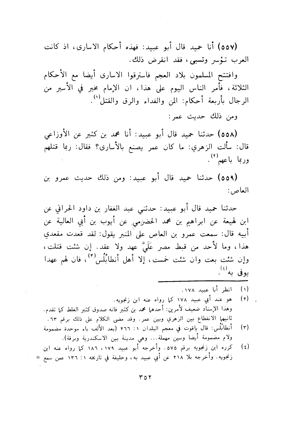 560 - قَالَ أَبُو عُبَيْدٍ: فَقَدْ ذَكَرَ عُمَرُ بْنُ الْخَطَّابِ وَعَمْرُو بْنُ الْعَاصِ فِي الْأُسَارَى الْقَتْلَ وَالْبَيْعَ وَأَمَّا الْمَنُّ وَالْفِدَاءُ فَفِي التَّنْزِيلِ مَعَ مَا جَاءَ فِيهِمَا مِنَ الْحَدِيثِ فَهَذِهِ أَحْكَامٌ أَرْبَعَةٌ وَإِنَّمَا هَذَا فِي الرِّجَالِ خَاصَّةً فَأَمَّا النِّسَاءُ وَالذُّرِّيَّةُ فَلَيْسَ فِيهِمْ إِلَّا حُكْمٌ وَاحِدٌ وَهُوَ الرِّقُّ لَا غَيْرَهُ، وَلَيْسَ الْمَنُّ عَلَى الْأَسِيرِ أَنْ يُتْرَكَ حَتَّى يَرْجِعَ إِلَى دَارِ الْحَرْبِ كَافِرًا وَلَكِنَّهُ يَكُونُ فِي دَارِ الْإِسْلَامِ ذِمِّيًّا يُؤَدِّي الْجِزْيَةَ كَفِعْلِ عُمَرَ بِأَهْلِ السَّوَادِ وَكَحَدِيثِهِ الْآخَرِ