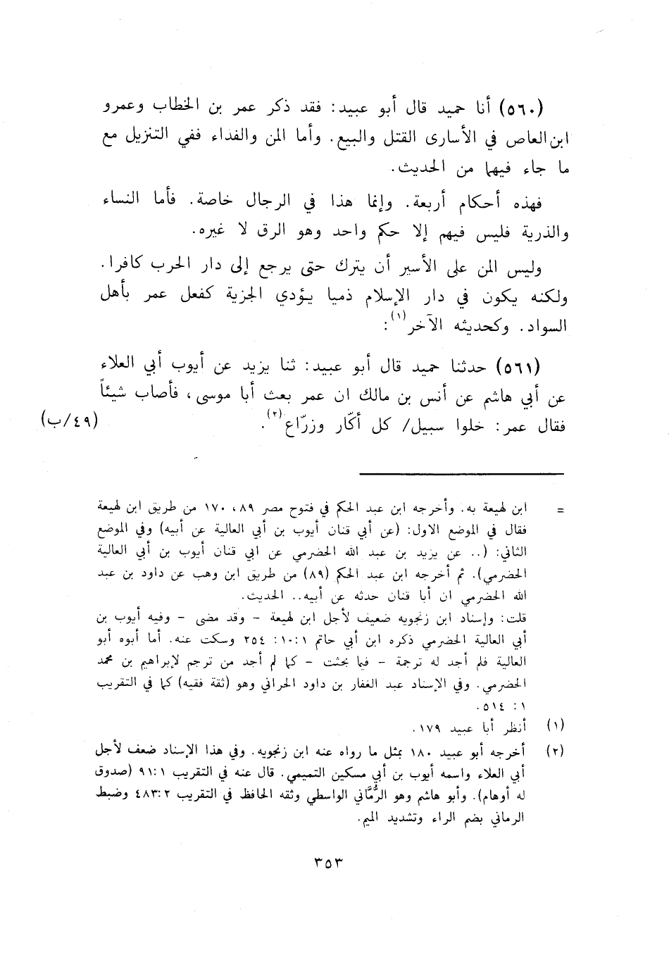 561 - قَالَ أَبُو عُبَيْدٍ: ثنا يَزِيدُ، عَنْ أَيُّوبَ أَبِي الْعَلَاءِ، عَنْ أَبِي هَاشِمٍ، عَنْ أَنَسِ بْنِ مَالِكٍ، أَنَّ عُمَرَ، بَعَثَ أَبَا مُوسَى، فَأَصَابَ شَيْئًا فَقَالَ عُمَرُ: «§خَلُّوا سَبِيلَ كُلِّ أَكَّارٍ وَزَرَّاعٍ» -[354]-. حَدَّثَنَا حُمَيْدٌ