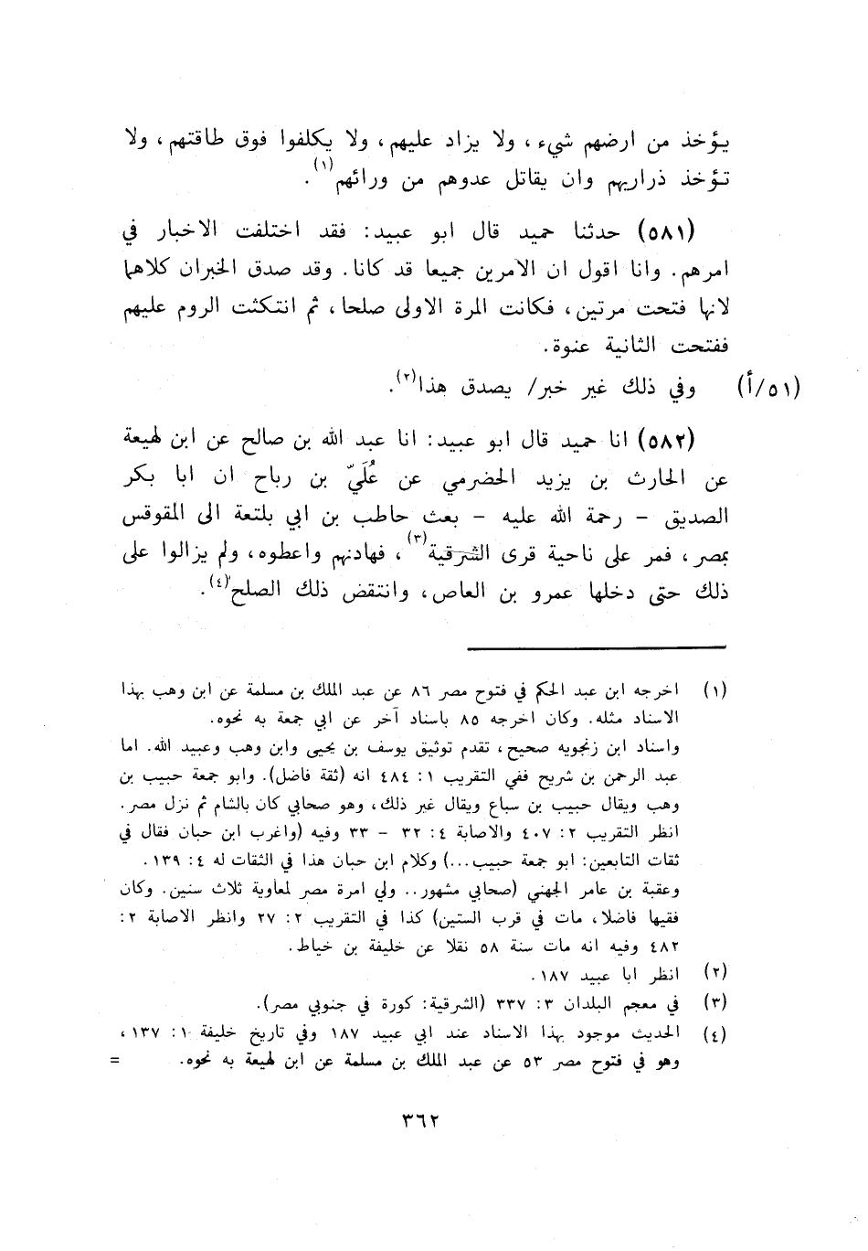 583 - قَالَ أَبُو عُبَيْدٍ: وثنا عَبْدُ اللَّهِ بْنُ صَالِحٍ، عَنِ اللَّيْثِ بْنِ سَعْدٍ، عَنْ يَزِيدَ بْنِ أَبِي حَبِيبٍ، أَنَّ الْمُقَوْقِسَ الَّذِي، كَانَ عَلَى مِصْرَ، كَانَ صَالَحَ عَمْرَو بْنَ الْعَاصِ عَلَى أَنْ يَفْرِضَ عَلَى الْقِبْطِ دِينَارَيْنِ دِينَارَيْنِ، فَبَلَغَ ذَلِكَ هِرَقْلَ صَاحِبَ الرُّومِ، فَتَسَخَّطَ أَشَدَّ التَّسَخُّطِ، وَبَعَثَ الْجُيُوشَ فَأَغْلَقُوا الْإِسْكَنْدَرِيَّةَ وَآذَنُوا عَمْرَو بْنَ الْعَاصِ بِالْحَرْبِ، فَقَاتَلَهُمْ، فَكَتَبَ إِلَى عُمَرَ بْنِ الْخَطَّابِ: أَمَّا بَعْدُ، فَإِنَّ اللَّهَ تَعَالَى §فَتَحَ عَلَيْنَا الْإِسْكَنْدَرِيَّةَ عَنْوَةً قَسْرًا، بِلَا عَهْدٍ وَلَا عَقْدٍ قَالَ: فَمِصْرُ كُلُّهَا صُلْحٌ - فِي قَوْلِ يَزِيدَ بْنِ أَبِي حَبِيبٍ - غَيْرَ الْإِسْكَنْدَرِيَّةِ قَالَ: وَبِهَذَا الْقَوْلِ كَانَ يَقُولُ لَيْثٌ