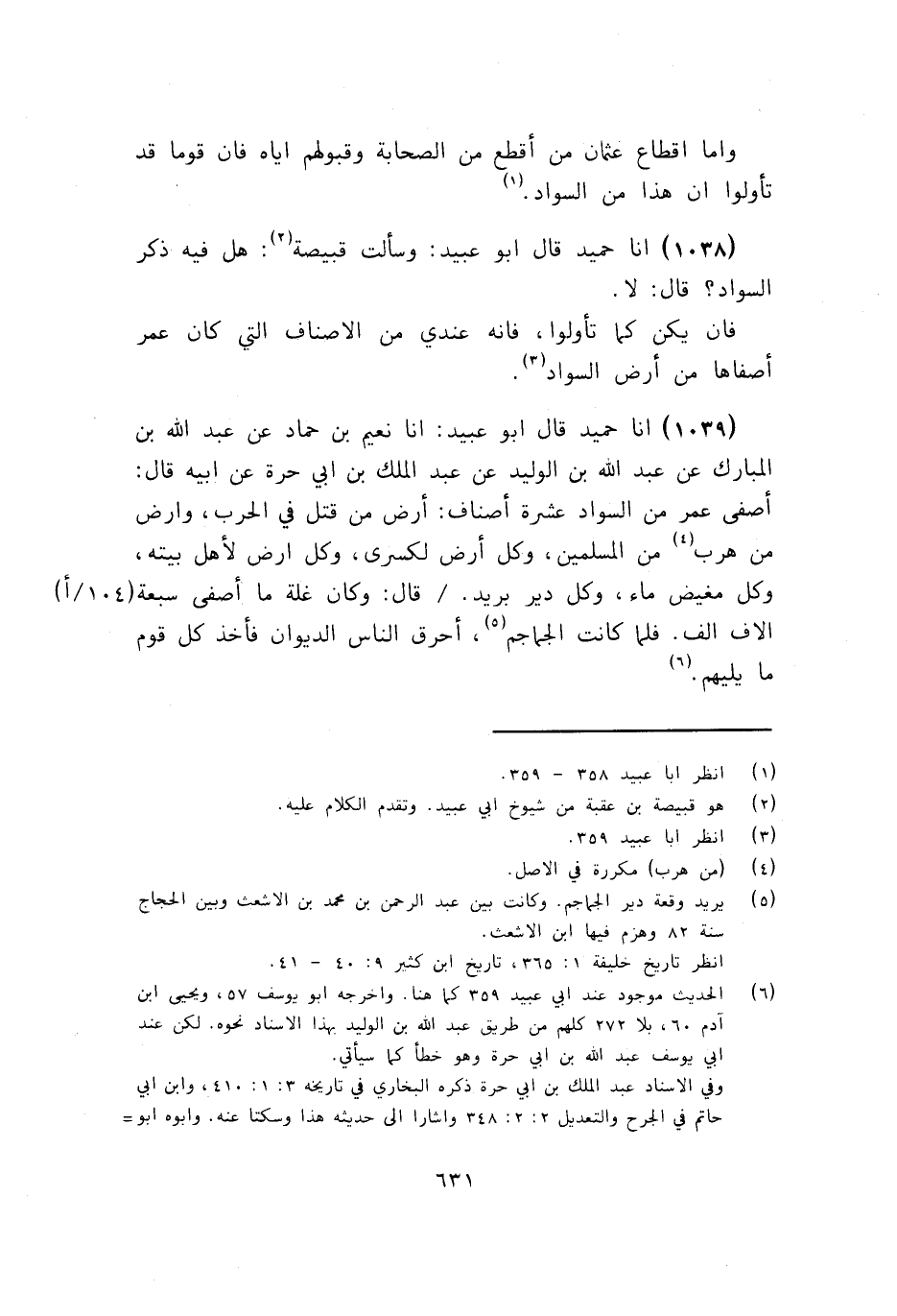 1039 - قَالَ أَبُو عُبَيْدٍ: أنا نُعَيْمُ بْنُ حَمَّادٍ، عَنْ عَبْدِ اللَّهِ بْنِ الْمُبَارَكِ، عَنْ عَبْدِ اللَّهِ بْنِ الْوَلِيدِ، عَنْ عَبْدِ الْمَلِكِ بْنِ أَبِي حُرَّةَ، عَنْ أَبِيهِ، قَالَ: §أَصْفَى عُمَرُ مِنَ السَّوَادِ عَشَرَةَ أَصْنَافٍ: أَرْضَ مَنْ قُتِلَ فِي الْحَرْبِ، وَأَرْضَ مَنْ هَرَبَ مِنَ الْمُسْلِمِينَ، وَكُلَّ أَرْضٍ لِكِسْرَى، وَكُلَّ أَرْضٍ لِأَهْلِ بَيْتِهِ، وَكُلَّ مَغِيضِ مَاءٍ، وَكُلِّ دَيْرِ بَرِيدٍ قَالَ: وَكَانَ غَلَّةُ مَا أَصْفَى سَبْعَةَ آلَافِ أَلْفٍ فَلَمَّا كَانَتِ الْجَمَاجِمُ، أَحْرَقَ النَّاسُ الدِّيوَانَ , فَأَخَذَ كُلُّ قَوْمٍ مَا يَلِيهِمْ " -[632]-. أَنَا حُمَيْدٌ