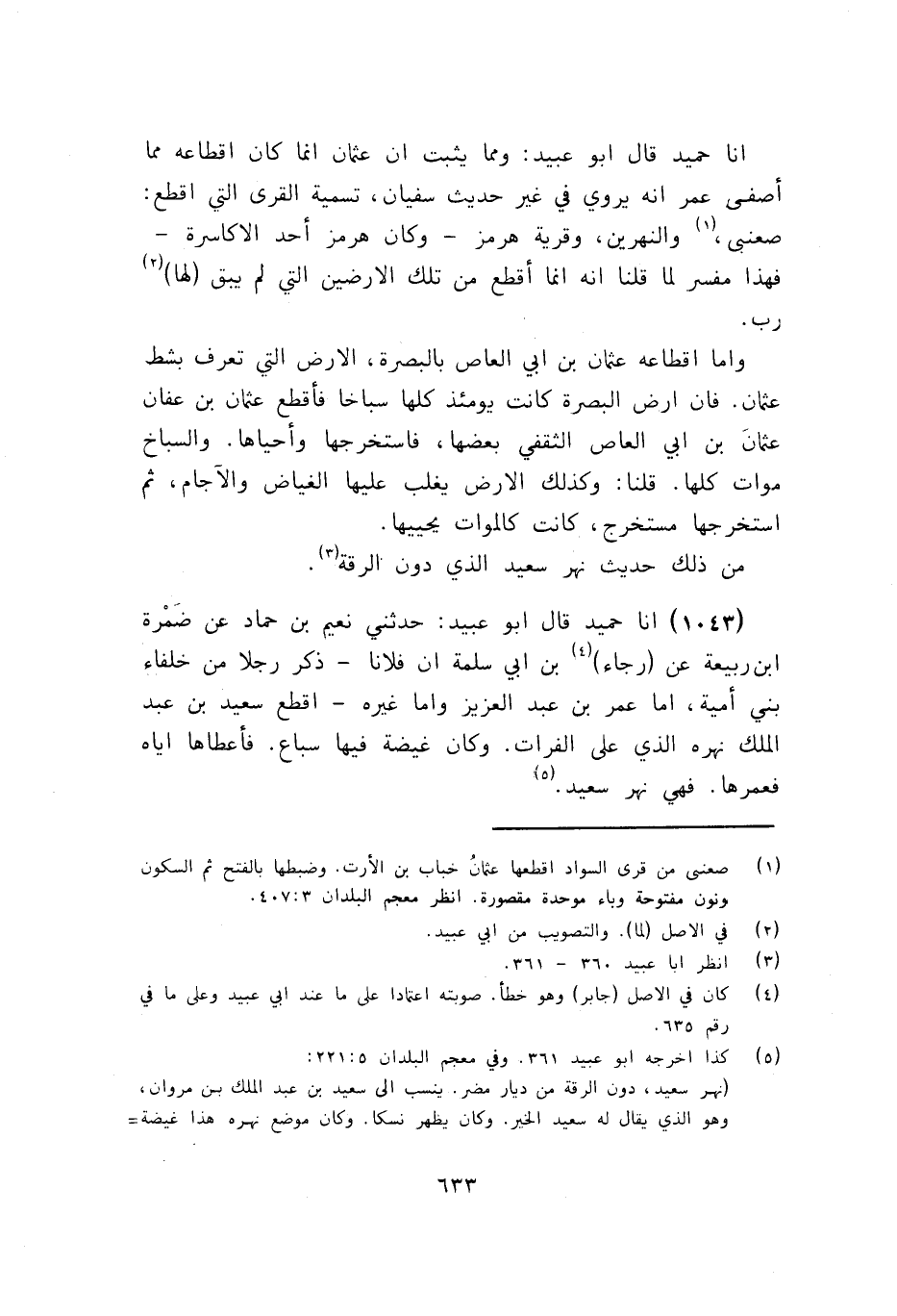 1043 - قَالَ أَبُو عُبَيْدٍ: حَدَّثَنِي نُعَيْمُ بْنُ حَمَّادٍ، عَنْ ضَمْرَةَ بْنِ رَبِيعَةَ، عَنْ رَجَاءِ بْنِ أَبِي سَلَمَةَ، أَنَّ فُلَانًا ذَكَرَ رَجُلًا مِنْ خُلَفَاءِ بَنِي أُمَيَّةَ، إِمَّا عُمَرُ بْنُ عَبْدِ الْعَزِيزِ وَإِمَّا غَيْرُهُ , §أَقْطَعَ سَعِيدَ بْنَ عَبْدِ الْمَلِكِ نَهْرَهُ الَّذِي عَلَى الْفُرَاتِ وَكَانَ غَيْضَةً فِيهَا سِبَاعٌ فَأَعْطَاهَا إِيَّاهُ فَعَمَّرَهَا , فَهِيَ نَهَرُ سَعِيدٍ -[634]-. أَنَا حُمَيْدٌ