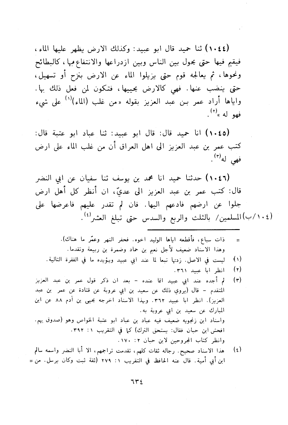1045 - قَالَ أَبُو عُبَيْدٍ: ثنا عَبَّادٌ أَبُو عُتْبَةَ، قَالَ: كَتَبَ عُمَرُ بْنُ عَبْدِ الْعَزِيزِ إِلَى أَهْلِ الْعِرَاقِ «§أَنَّ مَنْ غَلَّبَ الْمَاءَ عَلَى أَرْضٍ فَهِيَ لَهُ»