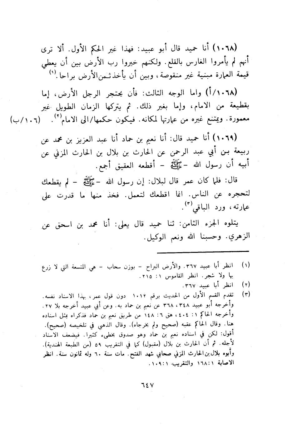 1069 - أَنَا حُمَيْدٌ أنا نُعَيْمُ بْنُ حَمَّادٍ، أنا عَبْدُ الْعَزِيزِ بْنُ مُحَمَّدٍ، عَنْ رَبِيعَةَ بْنِ أَبِي عَبْدِ الرَّحْمَنِ، عَنِ الْحَارِثِ بْنِ بِلَالِ بْنِ الْحَارِثِ الْمُزَنِيِّ، عَنْ أَبِيهِ، أَنَّ رَسُولَ اللَّهِ صَلَّى اللهُ عَلَيْهِ وَسَلَّمَ أَقْطَعَهُ الْعَقِيقَ أَجْمَعَ , قَالَ: فَلَمَّا كَانَ عُمَرُ قَالَ لِبِلَالٍ: إِنَّ رَسُولَ اللَّهِ صَلَّى اللهُ عَلَيْهِ وَسَلَّمَ §لَمْ يُقْطِعْكَ لِتَحْجُرَهُ عَنِ النَّاسِ , إِنَّمَا أَقْطَعَكَ لِتَعْمَلَ , فَخُذْ مِنْهَا مَا قَدَرْتَ عَلَى عِمَارَتِهِ، وَرَدَّ الْبَاقِي "