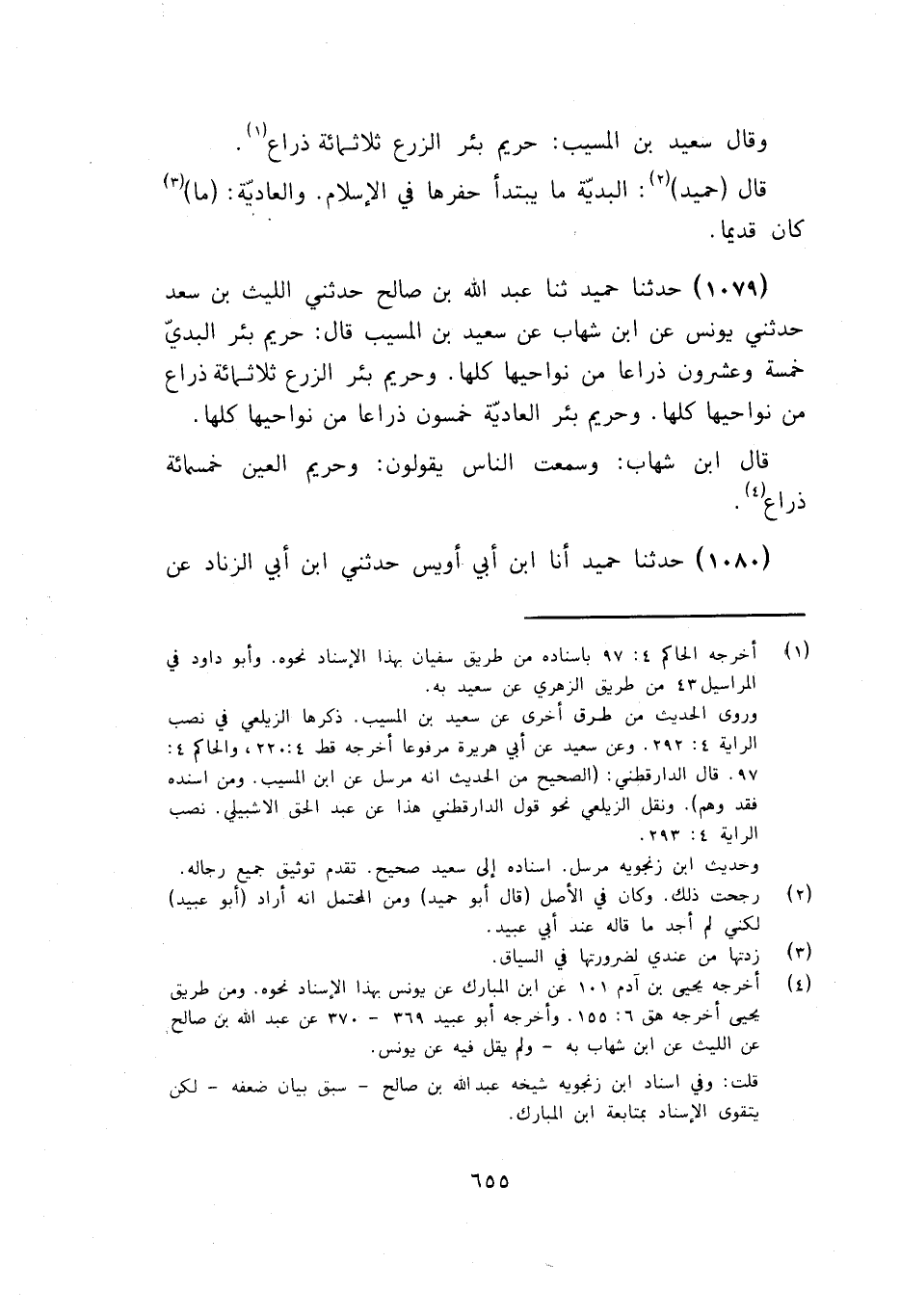 1079 - ثنا عَبْدُ اللَّهِ بْنُ صَالِحٍ، حَدَّثَنِي اللَّيْثُ بْنُ سَعْدٍ، حَدَّثَنِي يُونُسُ، عَنِ ابْنِ شِهَابٍ، عَنْ سَعِيدِ بْنِ الْمُسَيِّبِ، قَالَ: " §حَرِيمُ بِئْرِ الْبَدِيِّ خَمْسَةٌ وَعِشْرُونَ ذِرَاعًا مِنْ نَوَاحِيهَا كُلِّهَا , وَحَرِيمُ بِئْرِ الزَّرْعِ ثَلَاثُمِائَةِ ذِرَاعٍ مِنْ نَوَاحِيهَا كُلِّهَا وَحَرِيمُ بِئْرِ الْعَادِيَّةِ خَمْسُونَ ذِرَاعًا مِنْ نَوَاحِيهَا كُلِّهَا قَالَ ابْنُ شِهَابٍ: وَسَمِعْتُ النَّاسَ يَقُولُونَ: وَحَرِيمُ الْعَيْنِ خَمْسُمِائَةِ ذِرَاعٍ