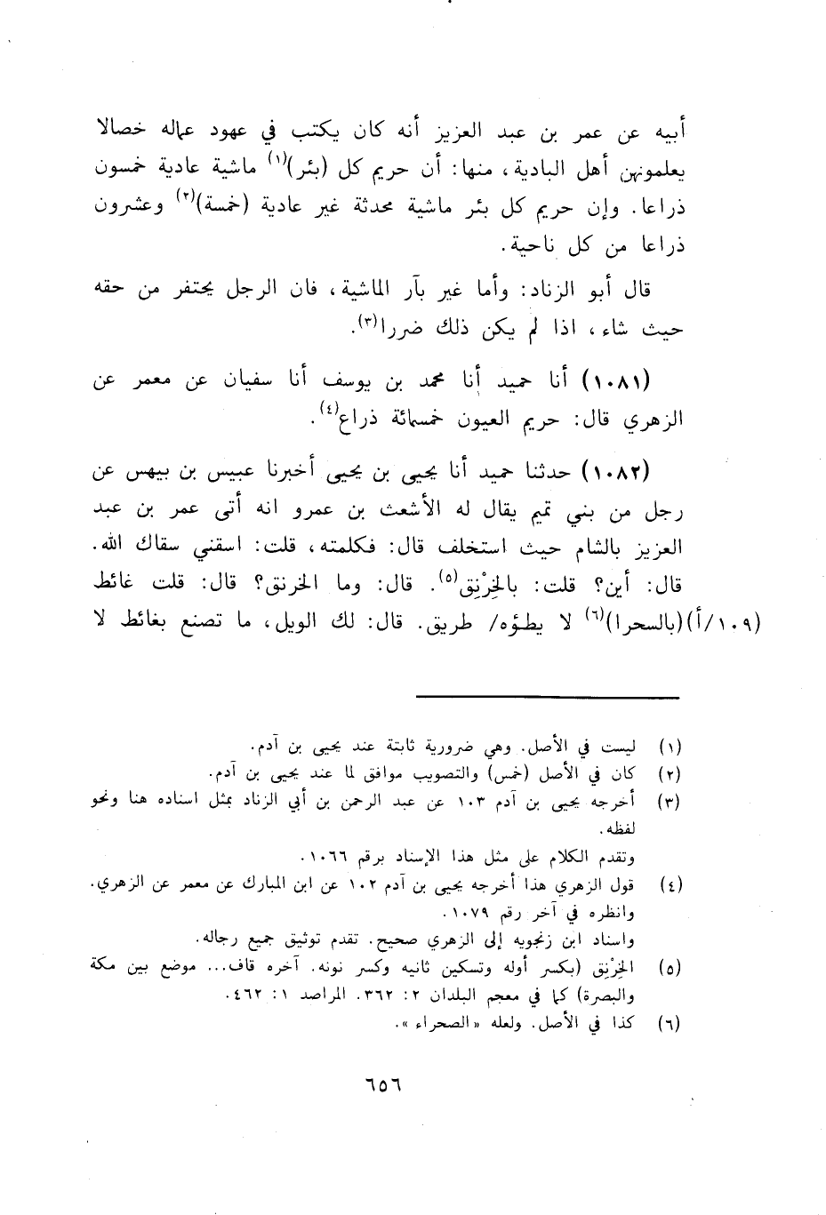1081 - أَنَا حُمَيْدٌ أنا مُحَمَّدُ بْنُ يُوسُفَ، أنا سُفْيَانُ، عَنْ مَعْمَرٍ، عَنِ الزُّهْرِيِّ، قَالَ: «§حَرِيمُ الْعُيُونِ خَمْسُمِائَةِ ذِرَاعٍ»