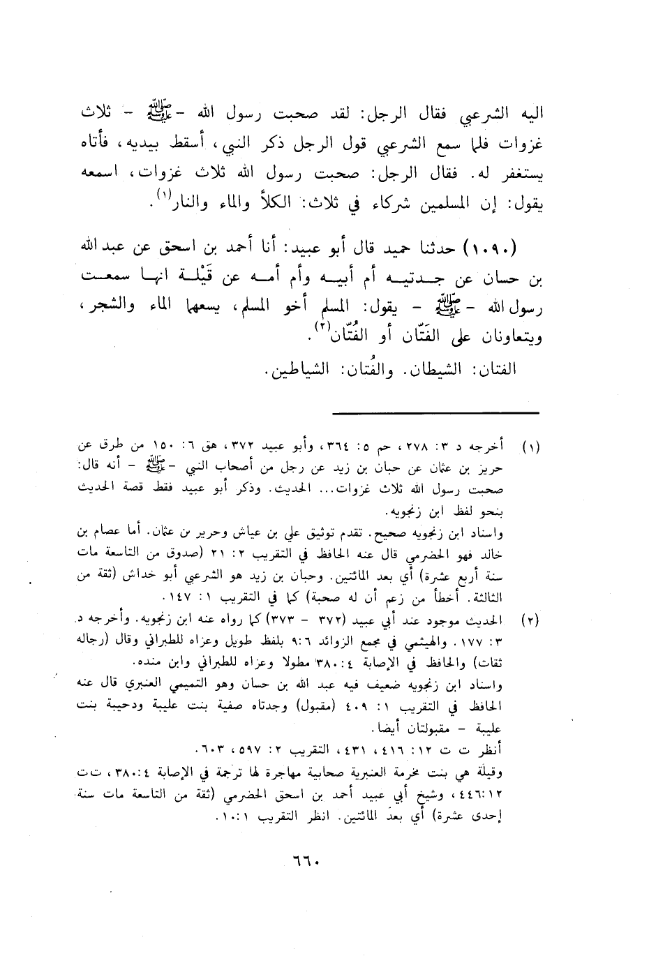 1090 - قَالَ أَبُو عُبَيْدٍ: أنا أَحْمَدُ بْنُ إِسْحَاقَ، عَنْ عَبْدِ اللَّهِ بْنِ حَسَّانَ، عَنْ جَدَّتيِهِ أُمِّ أَبِيهِ وَأُمِّ أُمِّهِ عَنْ قَيْلَةَ، أَنَّهَا سَمِعَتْ رَسُولَ اللَّهِ صَلَّى اللهُ عَلَيْهِ وَسَلَّمَ يَقُولُ: «§الْمُسْلِمُ أَخُو الْمُسْلِمِ , يَسَعُهُمَا الْمَاءُ وَالشَّجَرُ وَيَتَعَاوَنَانِ عَلَى الْفَتَّانِ - أَوِ الْفُتَّانِ» الْفَتَّانُ: الشَّيْطَانُ وَالْفُتَّانُ: الشَّيَاطِينُ