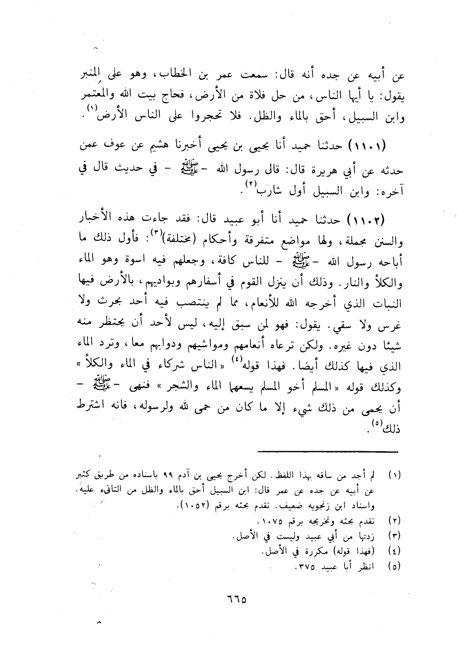 1102 - أنا أَبُو عُبَيْدٍ، قَالَ: فَقَدْ جَاءَتْ هَذِهِ الْأَخْبَارُ وَالسُّنَنُ مُجْمَلَةً، وَلَهَا مَوَاضِعُ مُتَفَرِّقَةٌ وَأَحْكَامٌ مُخْتَلِفَةٌ: فَأَوَّلُ ذَلِكَ مَا أَبَاحَهُ رَسُولُ اللَّهِ صَلَّى اللهُ عَلَيْهِ وَسَلَّمَ لِلنَّاسِ كَافَّةً، وَجَعَلَهُمْ فِيهِ أُسْوَةً , وَهُوَ الْمَاءُ وَالْكَلَأُ وَالنَّارُ وَذَلِكَ أَنْ يَنْزِلَ الْقَوْمُ فِي أَسْفَارِهِمْ وَبَوَادِيهِمْ بِالْأَرْضِ فِيهَا النَّبَاتُ الَّذِي أَخْرَجَهُ اللَّهُ لِلْأَنْعَامِ، مِمَّا لَمْ يَنْتَصِبْ فِيهِ أَحَدٌ بِحَرْثٍ وَلَا غَرْسٍ وَلَا سَقْيٍ يَقُولُ: فَهُوَ لِمَنْ سَبَقَ إِلَيْهِ، لَيْسَ لِأَحَدٍ أَنْ يَحْتَظِرَ مِنْهُ شَيْئًا دُونَ غَيْرِهِ وَلَكِنْ تَرْعَاهُ أَنْعَامُهُمْ وَمَوَاشِيهِمْ وَدَوَابُّهُمْ مَعًا، وَتَرِدُ الْمَاءَ الَّذِي فِيهَا كَذَلِكَ أَيْضًا فَهَذَا قَوْلُهُ: «النَّاسُ شُرَكَاءُ فِي الْمَاءِ وَالْكَلَأِ» وَكَذَلِكَ قَوْلُهُ: «الْمُسْلِمُ أَخُو الْمُسْلِمِ يَسَعُهُمَا الْمَاءُ وَالشَّجَرُ» فَنَهَى صَلَّى اللهُ عَلَيْهِ وَسَلَّمَ أَنْ يُحْمَى مِنْ ذَلِكَ شَيْءٌ إِلَّا مَا كَانَ مِنْ حِمًى لِلَّهِ وَلِرَسُولِهِ، فَإِنَّهُ اشْتَرَطَ ذَلِكَ -[666]-. حَدَّثَنَا حُمَيْدٌ